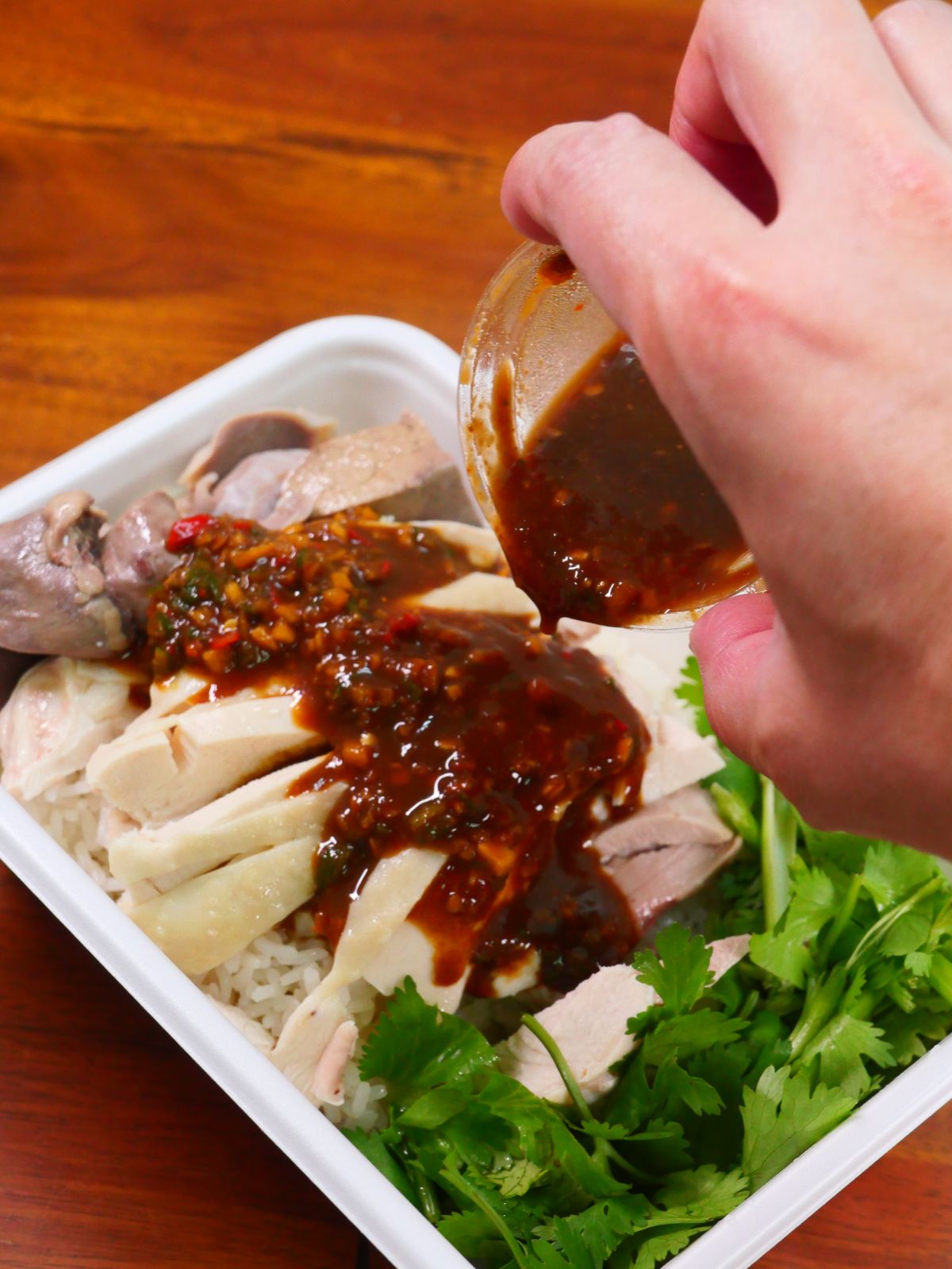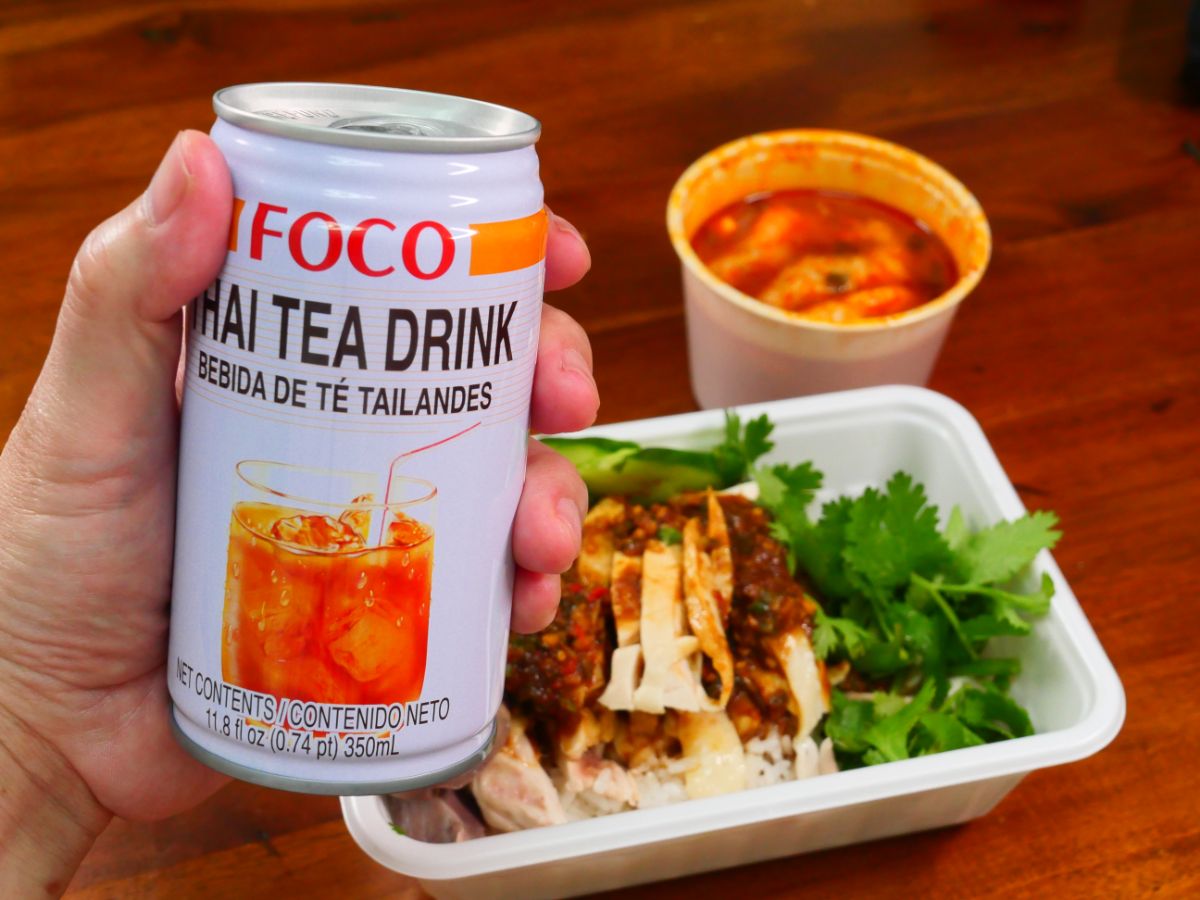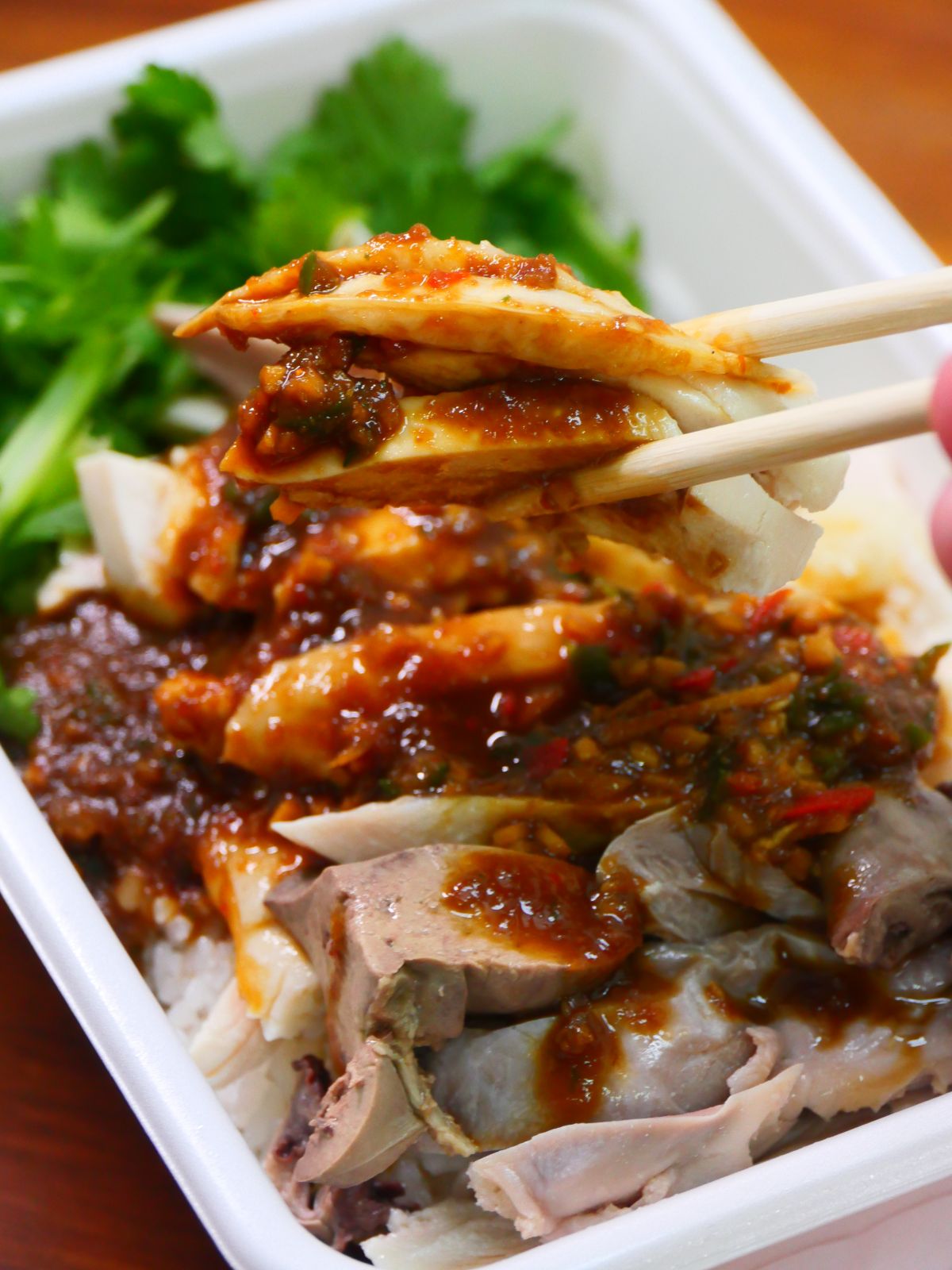 ソースをたっぷりとかけて食べる。……ぬおッ! 強めのスパイス感がありながらも、後味がタイ! 本場タイのカオマンガイの屋台で食べる味に近い後味。でも、後味までの道程でオリジナリティあふれるテイストを強く感じた。
