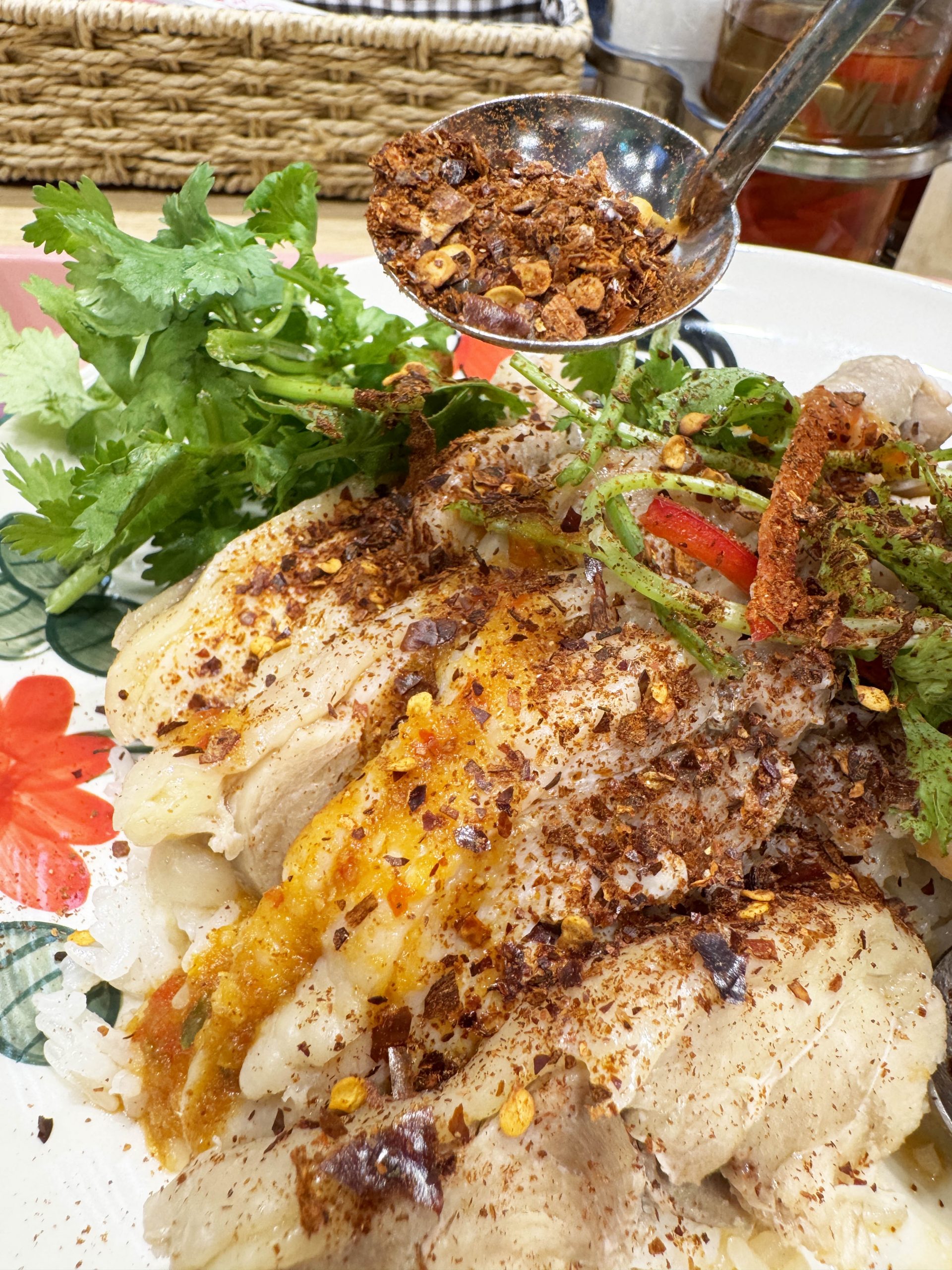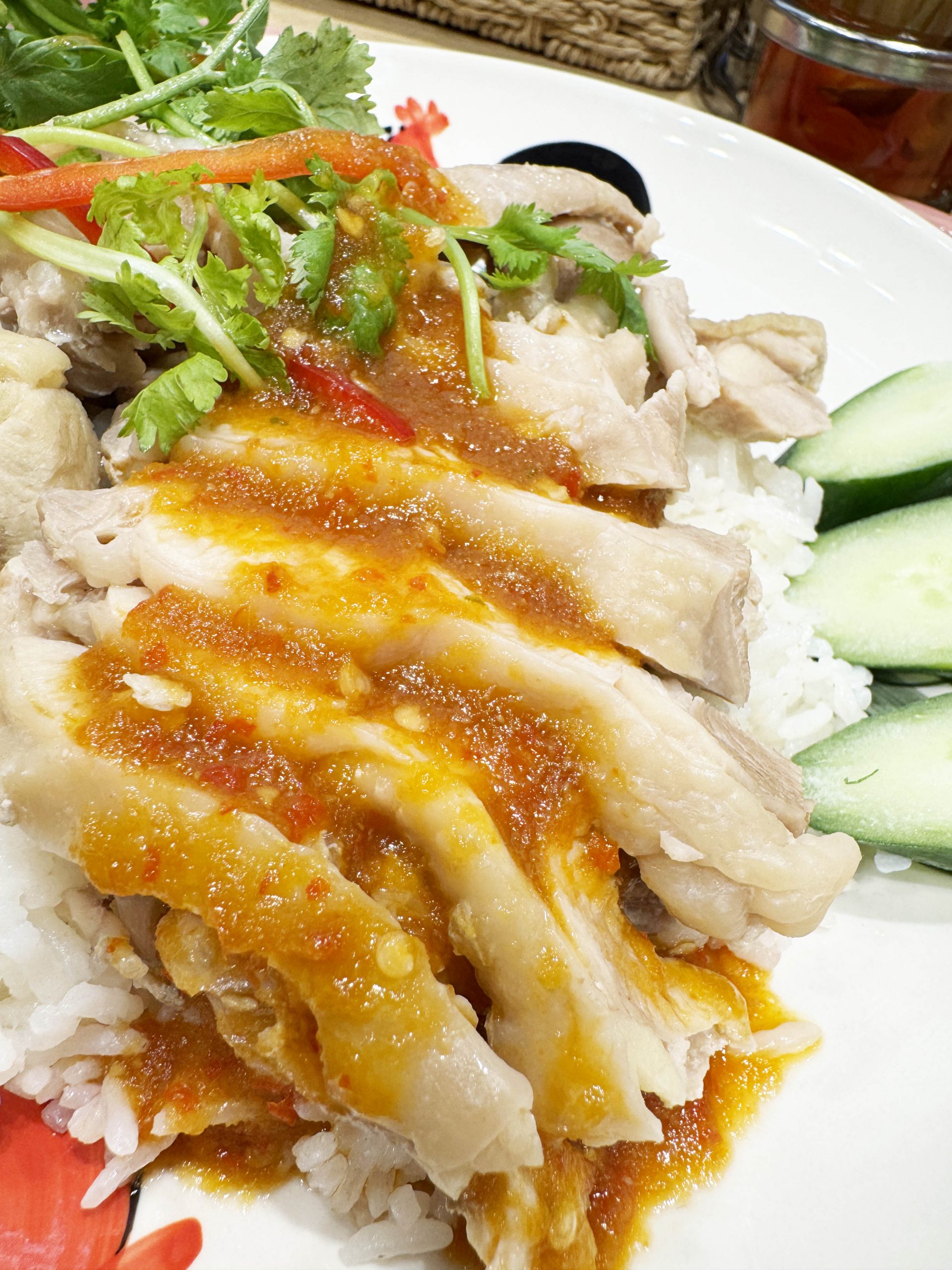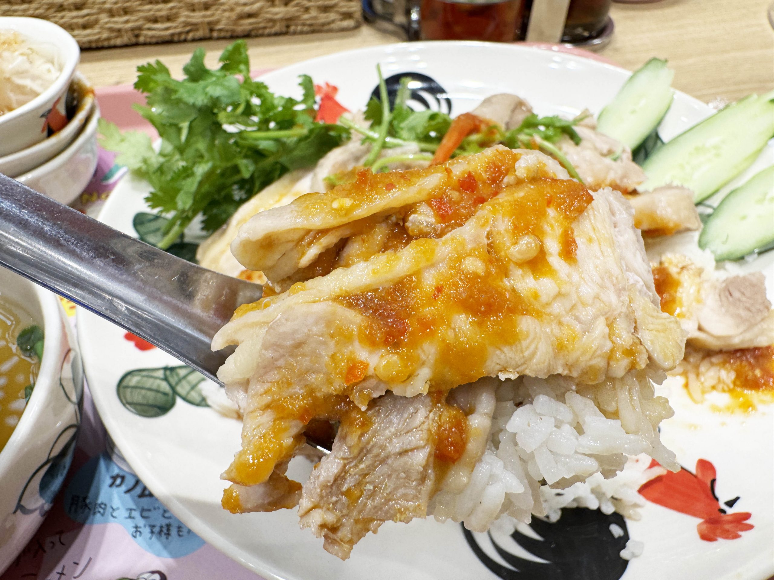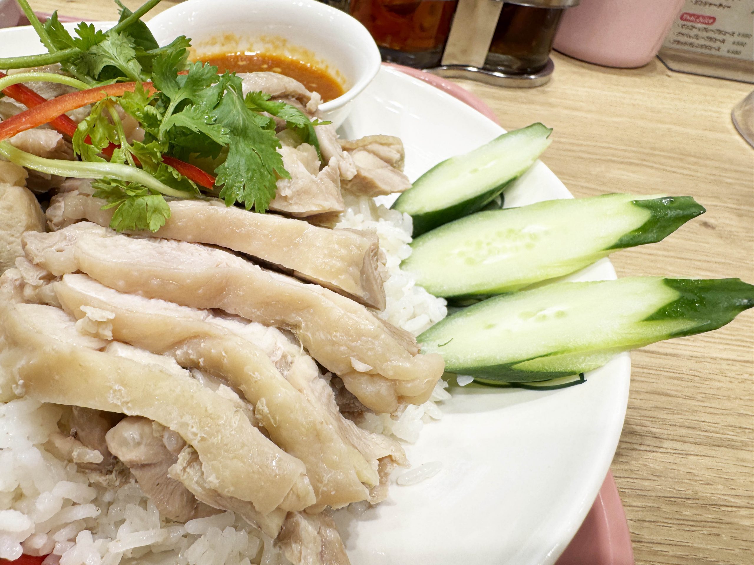 たっぷりとソースをかけて食べる。……ぬおッ! ソースからタイ感強く感じる酸味と辛味。鶏肉はけっこう硬めで、本場タイとは違うタイプに感じた。最近、いろんなお店でカオマンガイを食べているけど、けっこう硬めの鶏肉が多いかも。流行りなのかな?