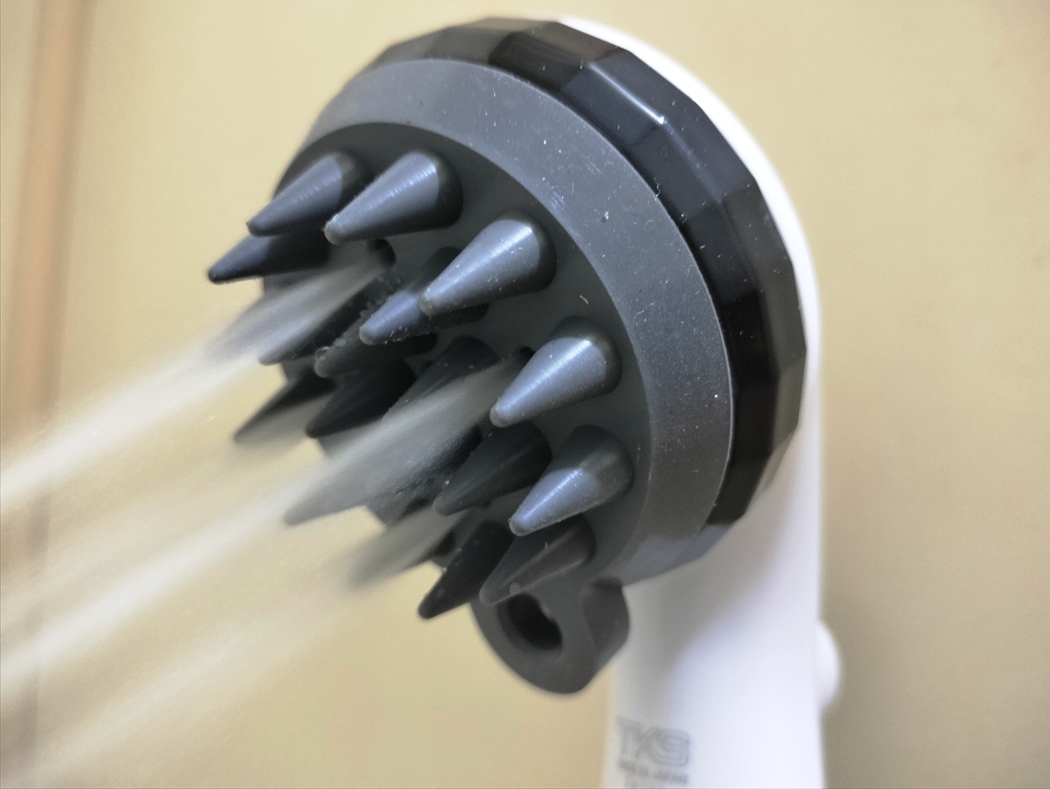 頭皮に強力な水流を直撃させることができるが、水流の軌跡をよく見てみると一点に収束しているのがわかる。手をかざすと、この部分が最も水圧を感じる。よってブラシを使用するときは直接当てるしかないが、流す際には少し離してこの水流が収束する部分を頭に直撃させればそれはそれは爽快で快適な洗髪のひと時が待っている。