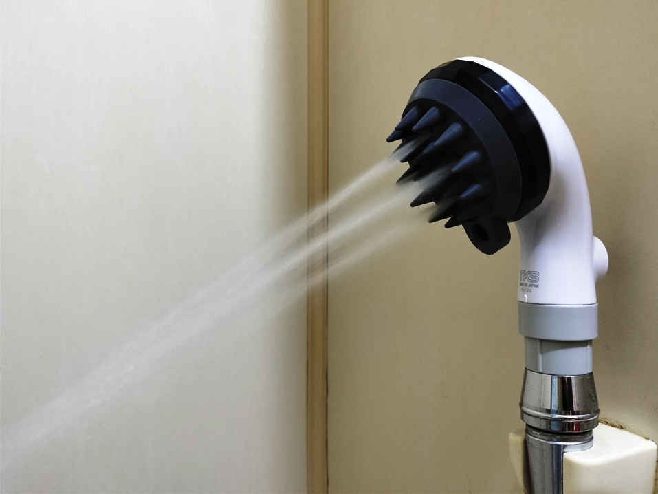 ということは、前述のフックを背後に設置して頭や背中にこの収束点が当たるようにすれば、打たせ湯的なシャワーが楽しめる。それだけ強力な水圧と、ファインバブルを含んだお湯の洗浄力がある。頭皮や頭髪のみならず洗いにくい背中はこのシャワーヘッドで解決するお助けアイテムにもなる。