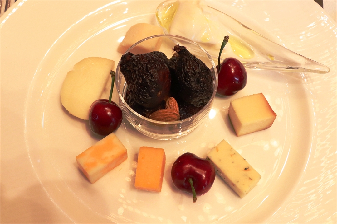 チーズの盛り合わせにプルーンとアーモンドにチェリーが添えられているが、実施にはスパークリングワインとのペアリングメニューだった。米国産チーズというのはなじみがないように思えるが、普通に美味しかった。特に「米国らしい」と思ったのはプルーンとチェリーでどちらも濃厚な風味でかみしめるほど美味しさがにじみ出るものだった。