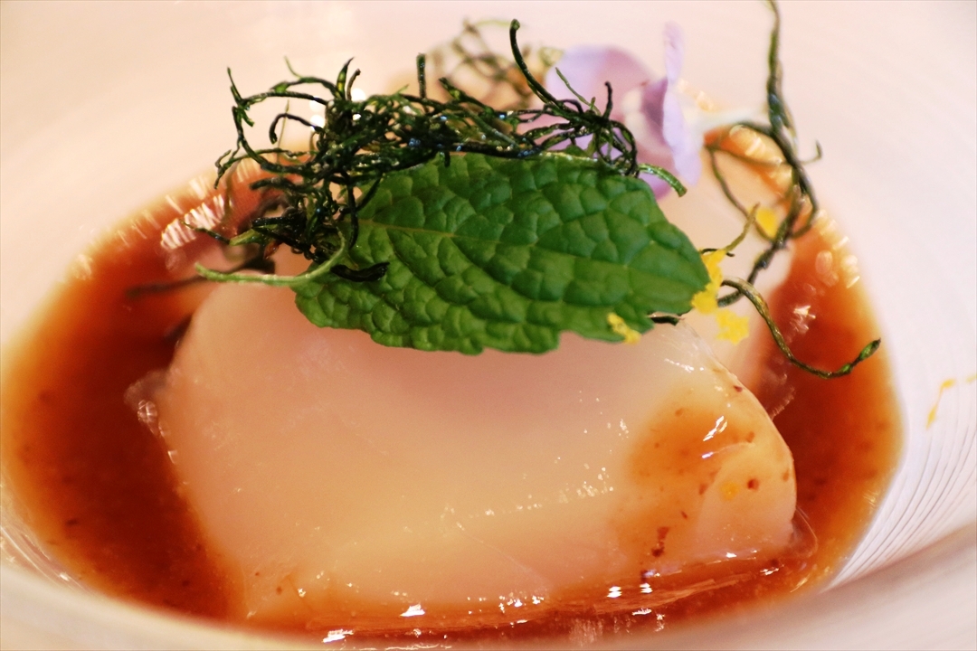 「北海道産ホタテのクルード(生仕立て)カリフォルニア産プルーンとオレンジの醤油ポン酢、マイクロミント添え。「Crudo(クルード)」はイタリア語で「生の」という意味で、オリーブオイルや柑橘類などで軽く味付けした生魚料理を指すらしい。「Californian Prune Orange Soy Ponzu」は、カリフォルニア産プルーンとオレンジ果汁、醤油を使った和洋折衷のポン酢ソースで、これが絶品だった。北海道産のホタテに日本人に合うソースの組み合わせは和食にも思えたが、ソースの中にはプルーンやオレンジ果汁といったカリフォルニアらしいフルーツが入っており、なるほど和洋折衷も納得の日本人好みの逸品だった。