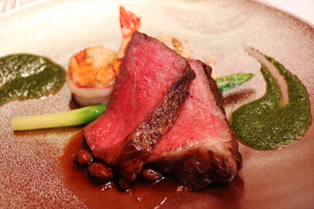 「F1和牛とBBQ海老のサーフ&ターフ サルサヴェルデ、カリフォルニアレーズンのジュ、カリフォルニアプルーンのクスクス添え」は、パッと見はローストビールのような感じだったが、フォークで取るとその分厚さはアメリカン級のステーキそのものと思わせるバーベキューだった。ソースにはもちろんカリフォルニア産が使われており、このソースにはレーズンが織り込まれている。こういうステーキもあるのかと日本人にはびっくりの大物だった。