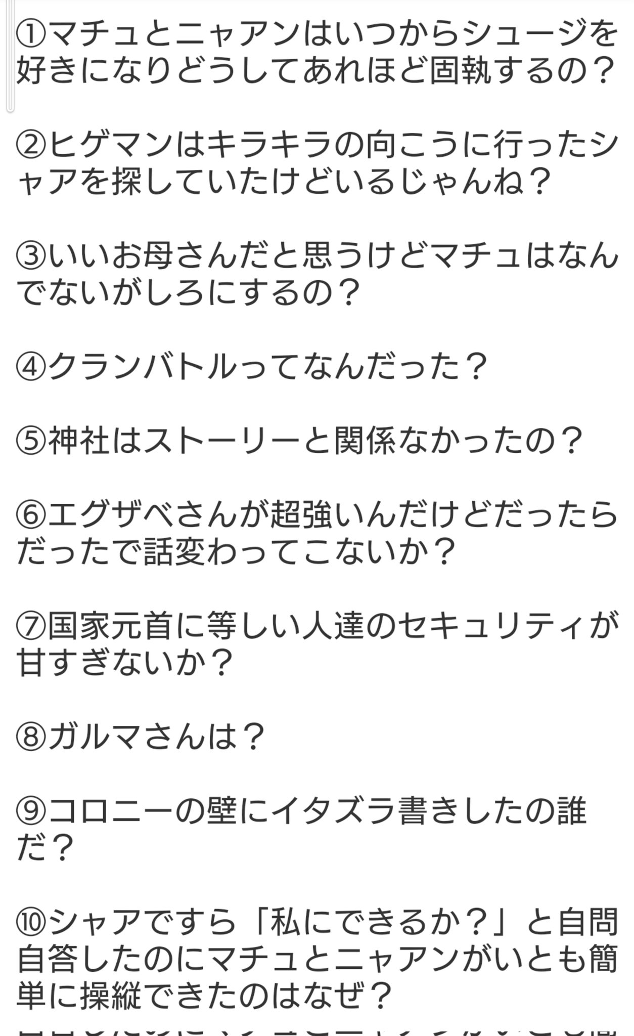 「せっかくまとめたし怒られないらしいから聞いてみよ。細かいのは捨てて10個。特に①③⑥が気になる。コレがわかると3倍たのしめる。とガンダムが言っている」