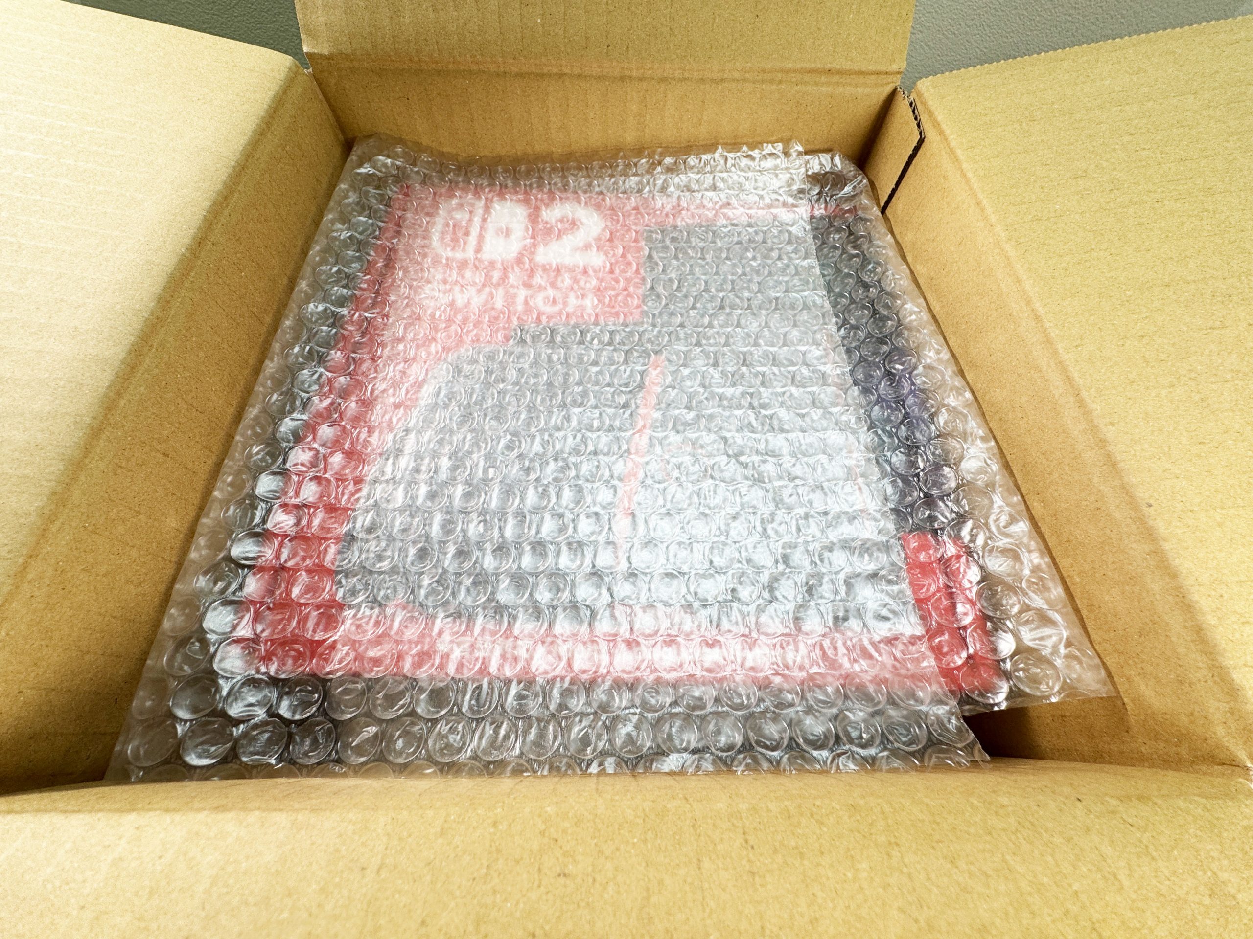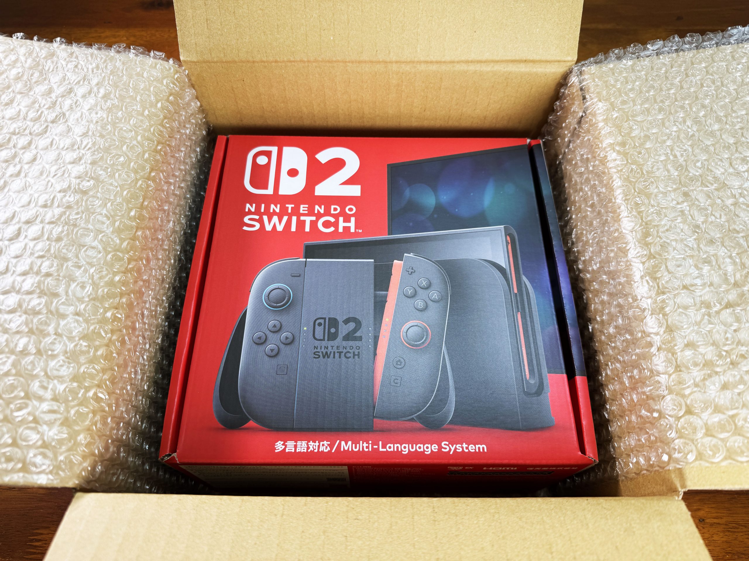 届いたダンボール箱を開封すると、明細書とチラシ、そしてプチプチ(気泡緩衝材)に包まれたNintendo Switch2本体の箱が入っていた。プチプチは完全密封ではなく、箱を包むように入れられていた。かなり丁寧で安心感のある包装である。