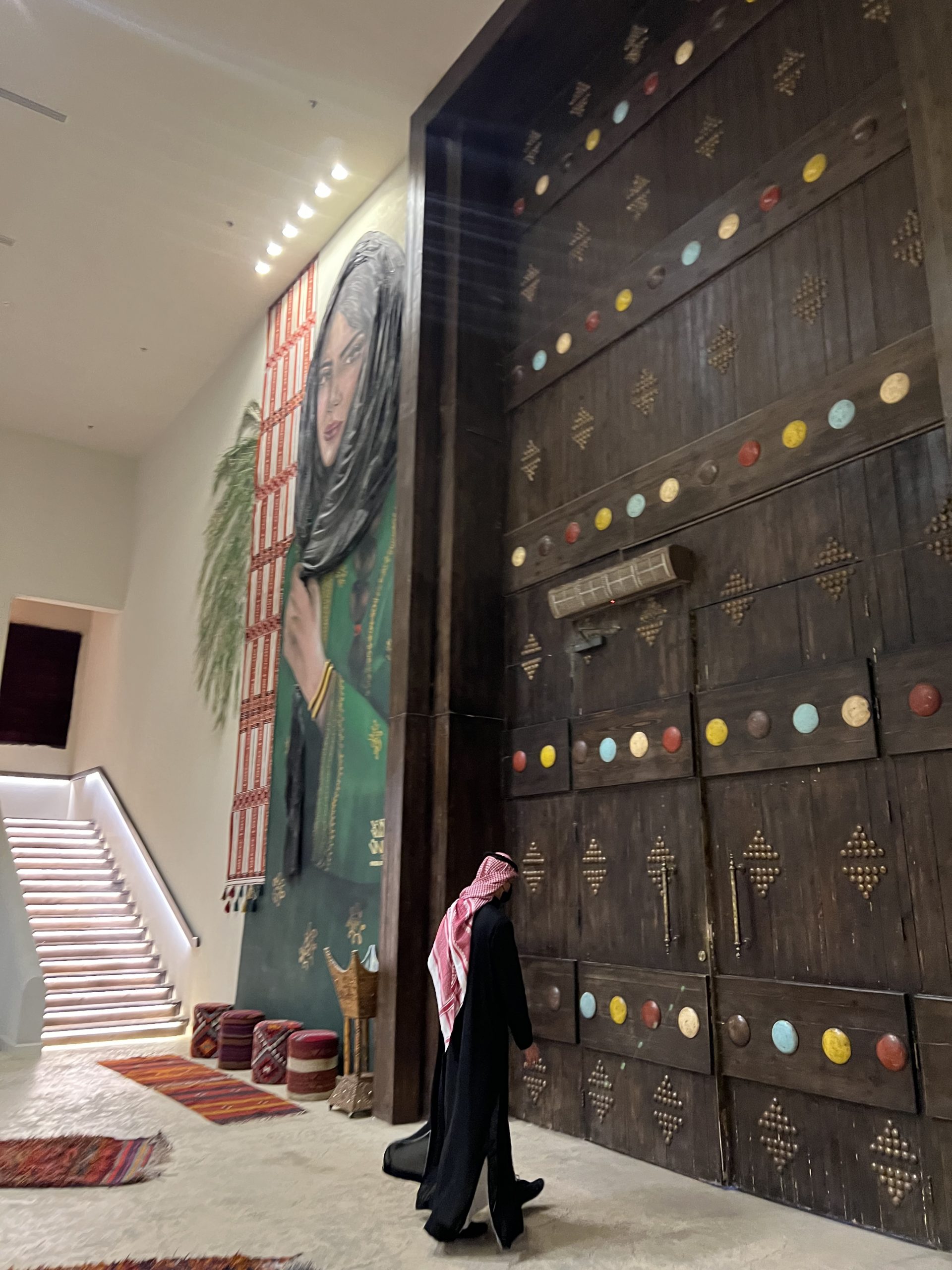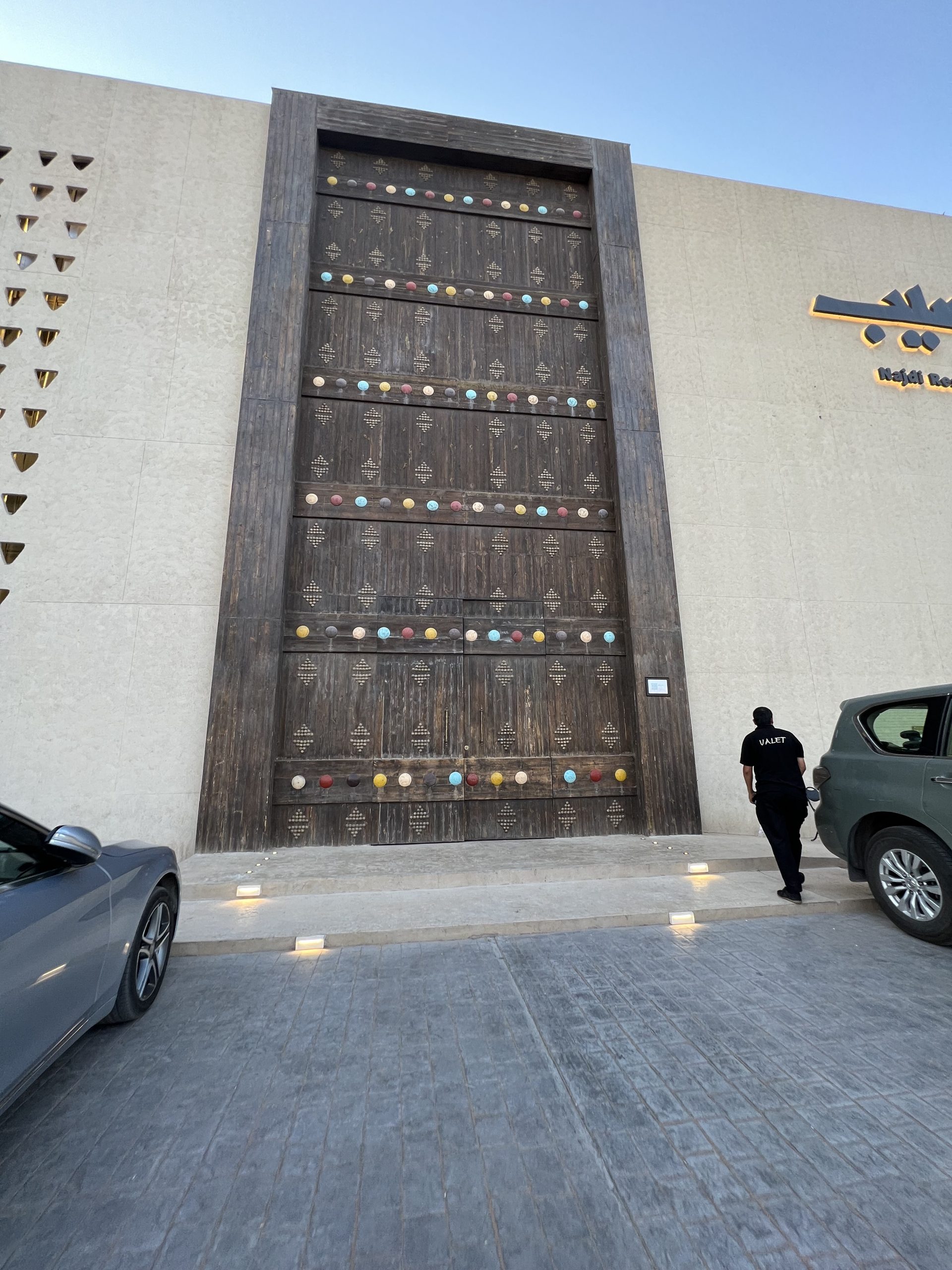 店舗に訪れる人がまず目にするのは、高さ6メートルを超える巨大な木製扉。この扉にはナジディの伝統的な幾何学模様が施され、カラフルな円形装飾がアクセントとして並んでいます。伝統的な文様が刻まれた重厚な戸の奥、古代の城塞をイメージさせるような立派な建物の中は、なかなかモダンな造りになっています。