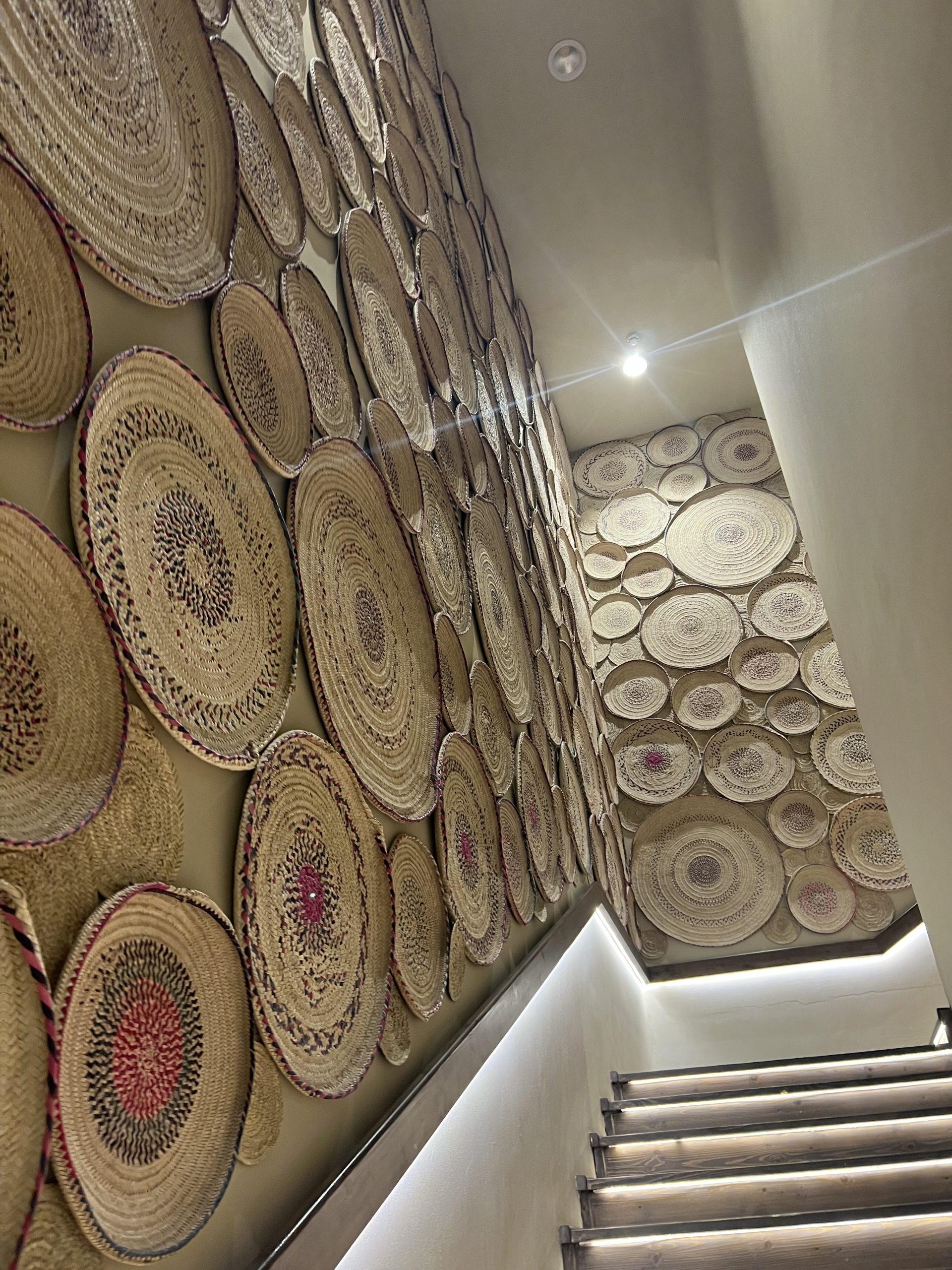店内は高い天井とやわらかな照明に包まれ、壁面一面には手編みのわら細工、民族文様が施された小物も各所に置かれており、まるで文化博物館に訪れたかのような空間が広がります。ナジディ様式の装飾が施された店内は、古代と現代が交差する象徴とも言えそうです。