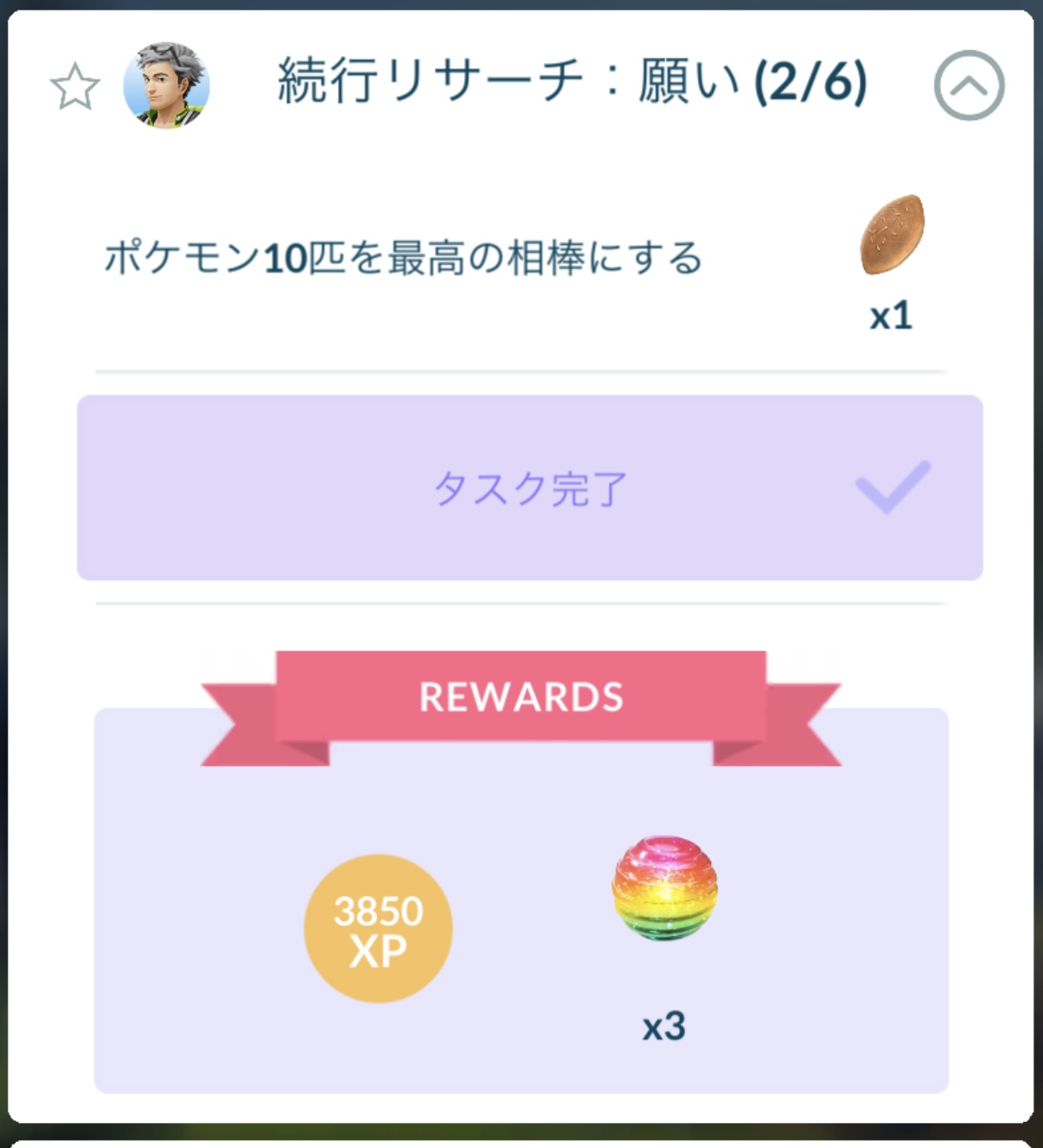 続行リサーチはスペシャルリサーチと比較すると高難易度なタスクが多いです。色違いジラーチの続行リサーチの実際のタスク内容を例にすると、