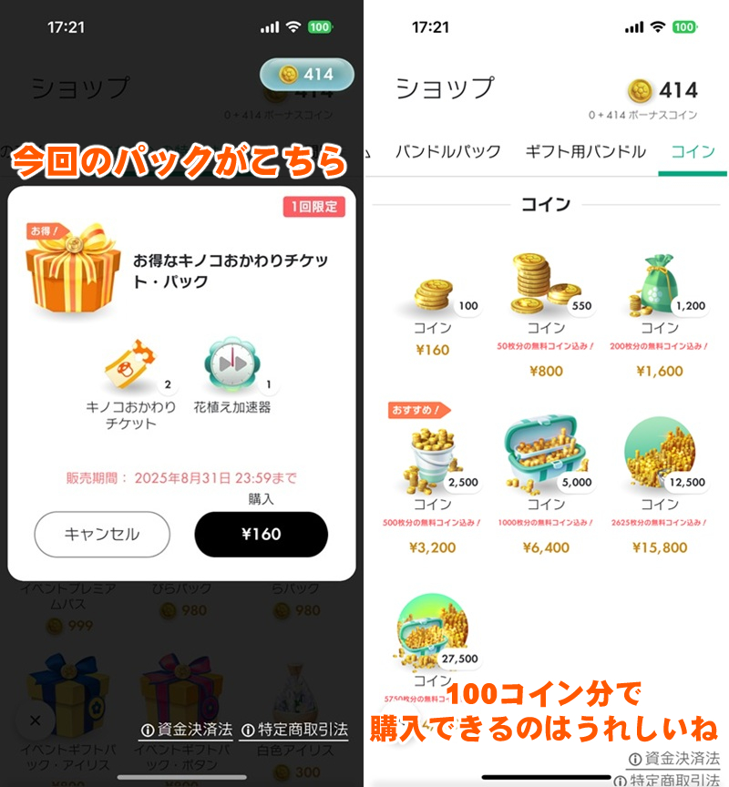 ふだん購入できる“キノコおかわりチケット”は1枚120コインで“花植え加速器”1個が200コイン。