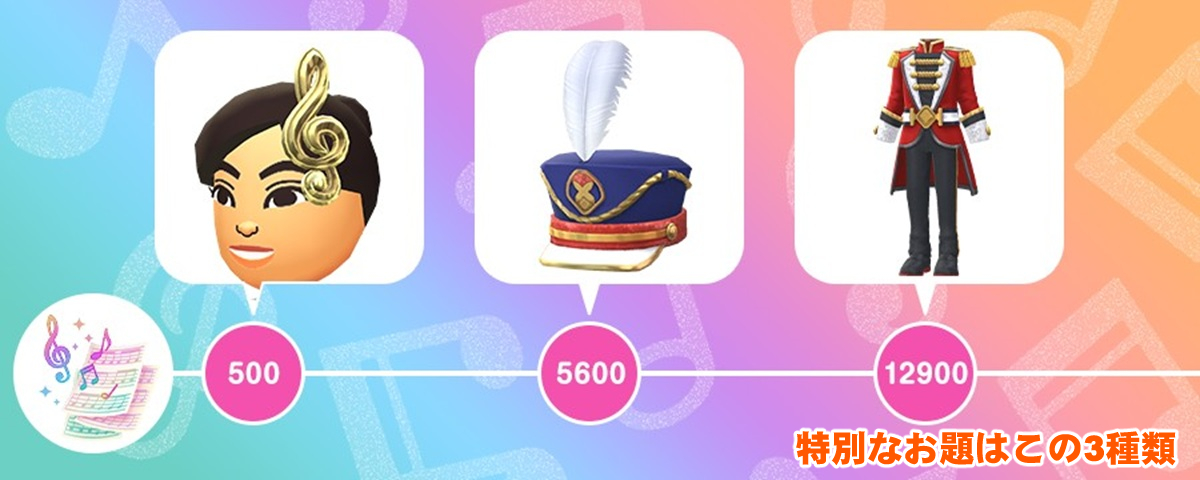 特別なお題側のMiiコスチュームを狙うにはキノコや花植えなどの報酬“マーチの楽譜”が必要。