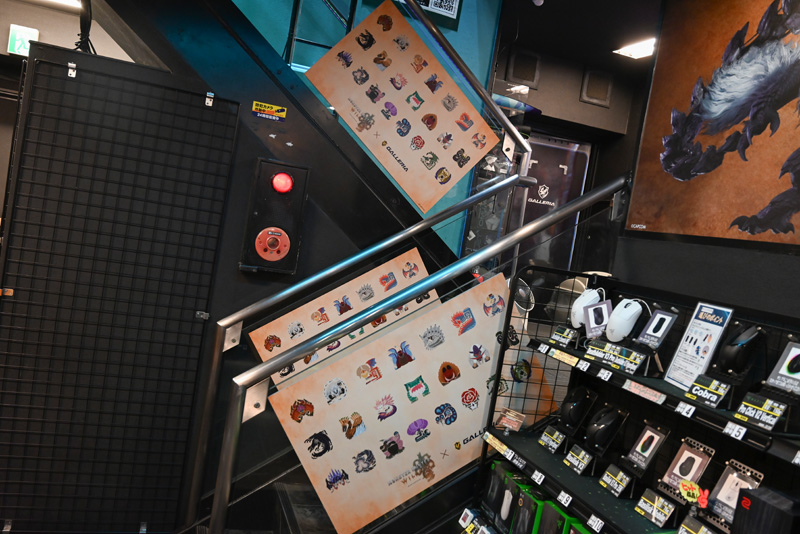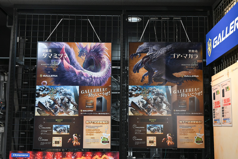 今回のコラボを記念して、「GALLERIA esports Lounge」店頭ではシリーズおなじみの「イャンクック」がお出迎え! 1階は、ポスターや商品ボードにも『モンスターハンターワイルズ』の世界観が再現されている。
