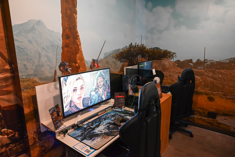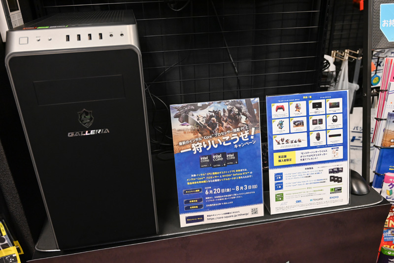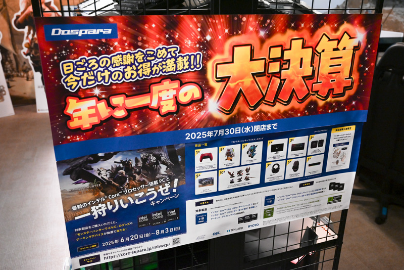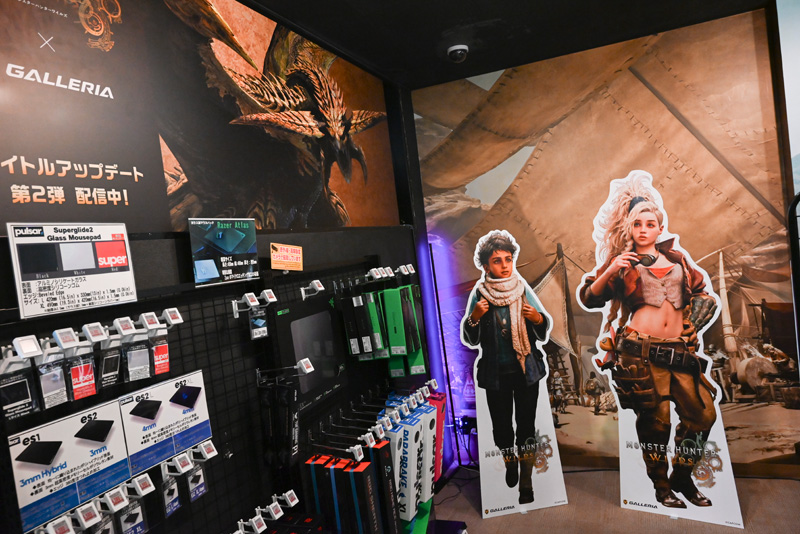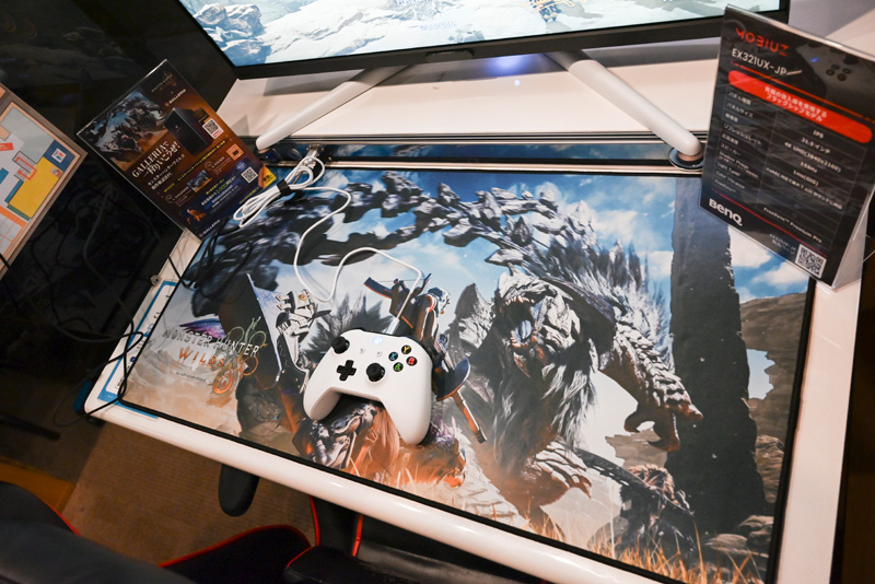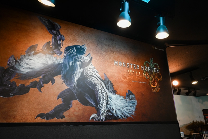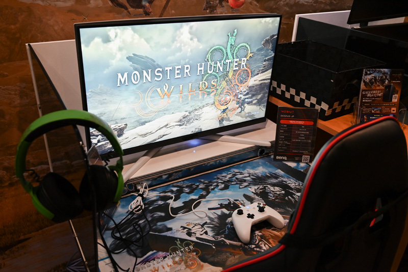 そして地下のプレイエリアでは、『モンスターハンターワイルズ』の試遊スペースも設けられ、ゲームを快適に楽しめるGALLERIA「モンスターハンターワイルズ動作確認済PC」と4Kゲーミングモニター(BenQ MOBIUZ EX321UX-JP、BenQ MOBIUZ EX271U)で臨場感あふれるプレイが可能だ。