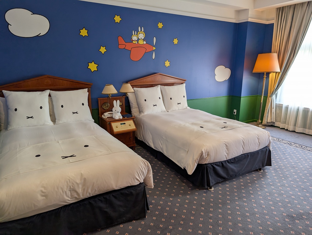 夕方、この新エリアのオープンを記念して、ハウステンボスオフィシャルホテル「ホテルアムステルダム」にある、空飛ぶミッフィーとアンクルパイロットの新デザインの“ミッフィールーム”を取材。こちらは2025年6月27日(金)より宿泊開始の新客室。寝ても覚めても興奮が続きます。