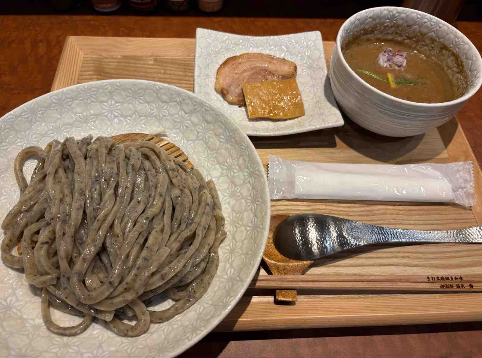 「御影つけめん並」を注文。具は芽ネギ、刻み紫タマネギ、ゆず皮。別皿でチャーシューとメンマ。麺は最高級特等小麦仕様手打ち式製法の御影麺。胡麻が練り込んである極太平打ち麺。