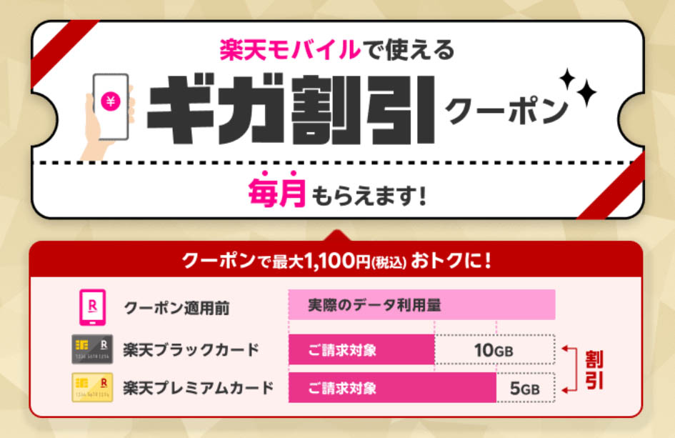 \楽天プレミアムカード会員様は5GB、楽天ブラックカード会員様は10GBのギガ割引クーポンを毎月進呈します😀✨