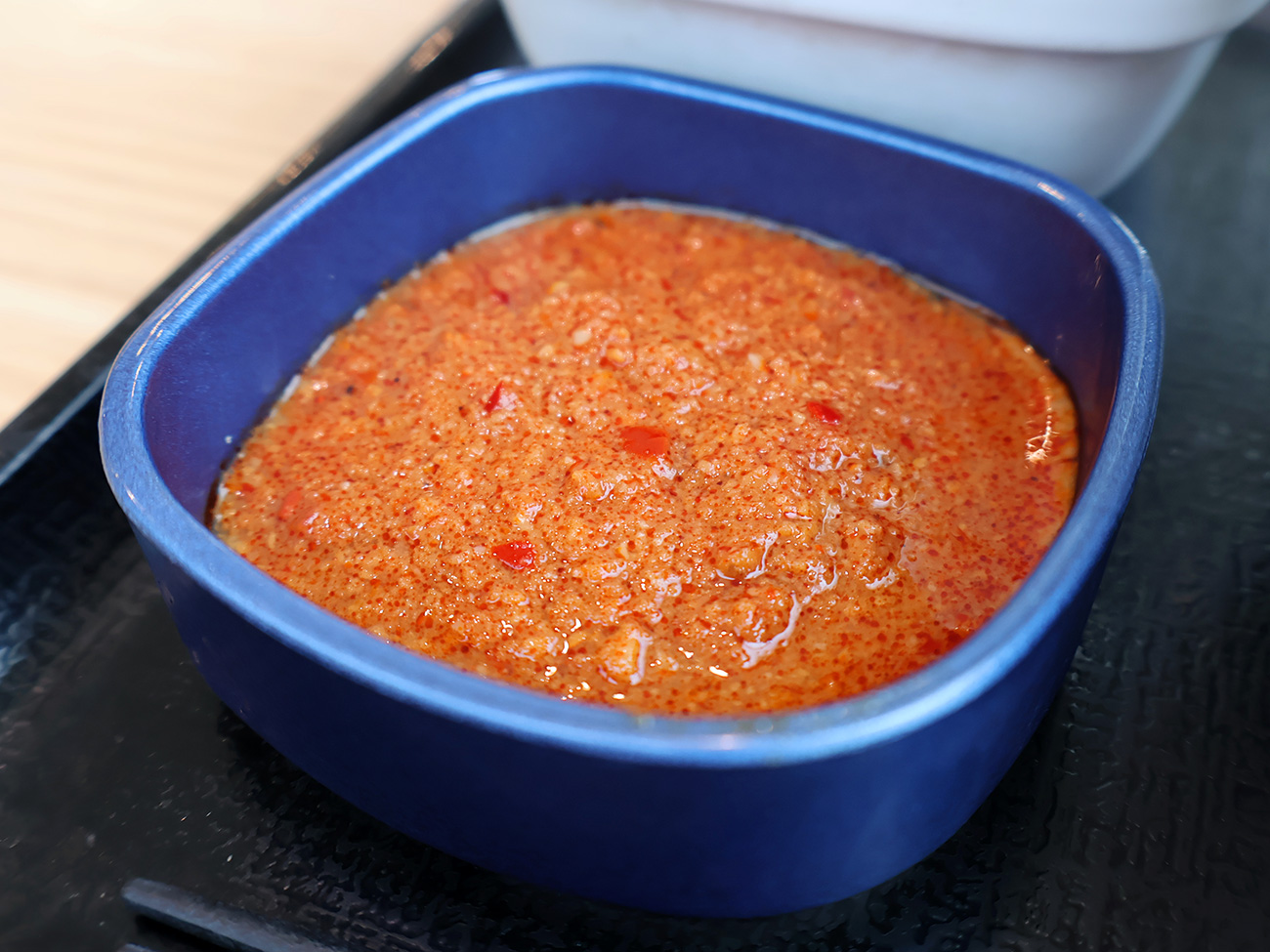 色からして唐辛子的な要素が強いのかなと思いきや、めちゃくちゃパワフルなにんにくテイスト。まろやかだった味が一気にビシーッと引き締まり、全体にメリハリが出てきました。教室に厳しい先生が入ってきて休み時間の空気が一気に締まるようなあの感じ!