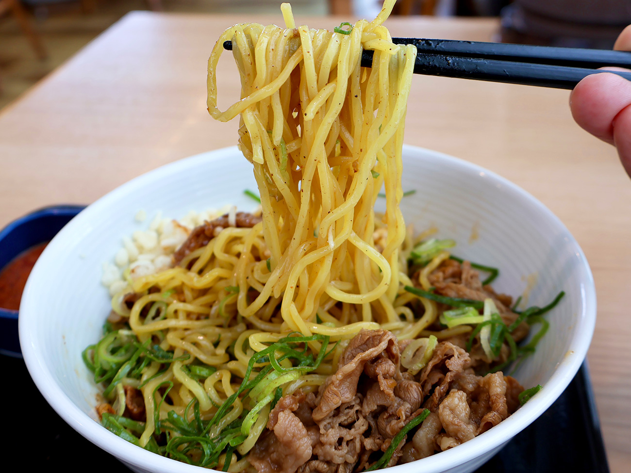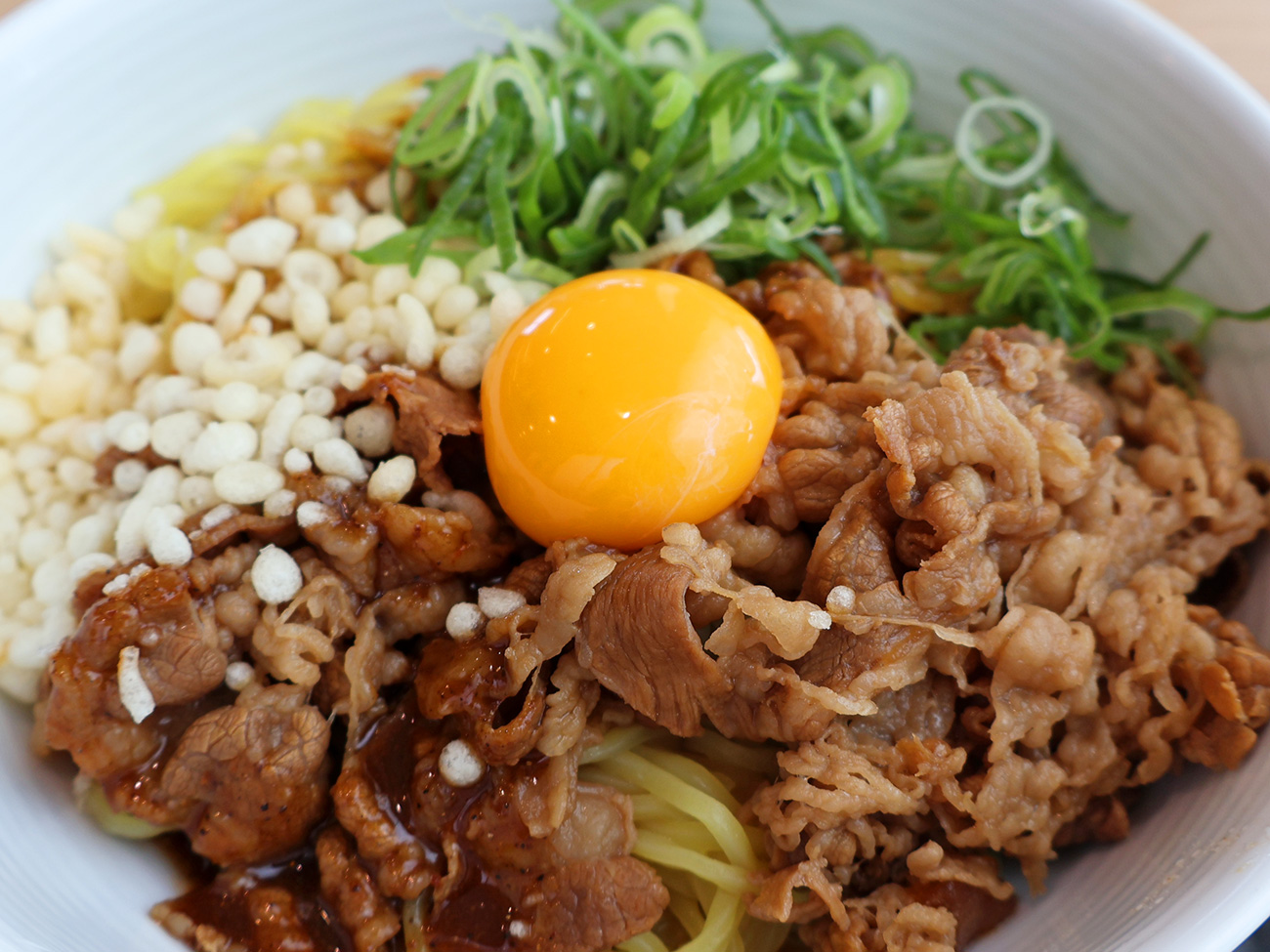 麺の上には牛肉とネギがたっぷりと盛り付けられ、まるで牛丼のご飯を麺にそのまま置き換えたかのよう。違いがあるとすれば揚げ玉が振りかけられていることと、牛肉の一部にタレがかけられているところでしょうか。