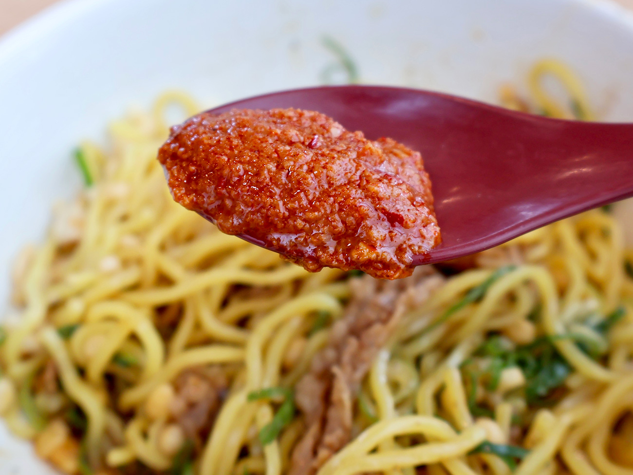 まずは麺を引っ張り出して食べてみましたが、気になったのはその細さ。まぜそばでは珍しく、なかなかの細麺です。