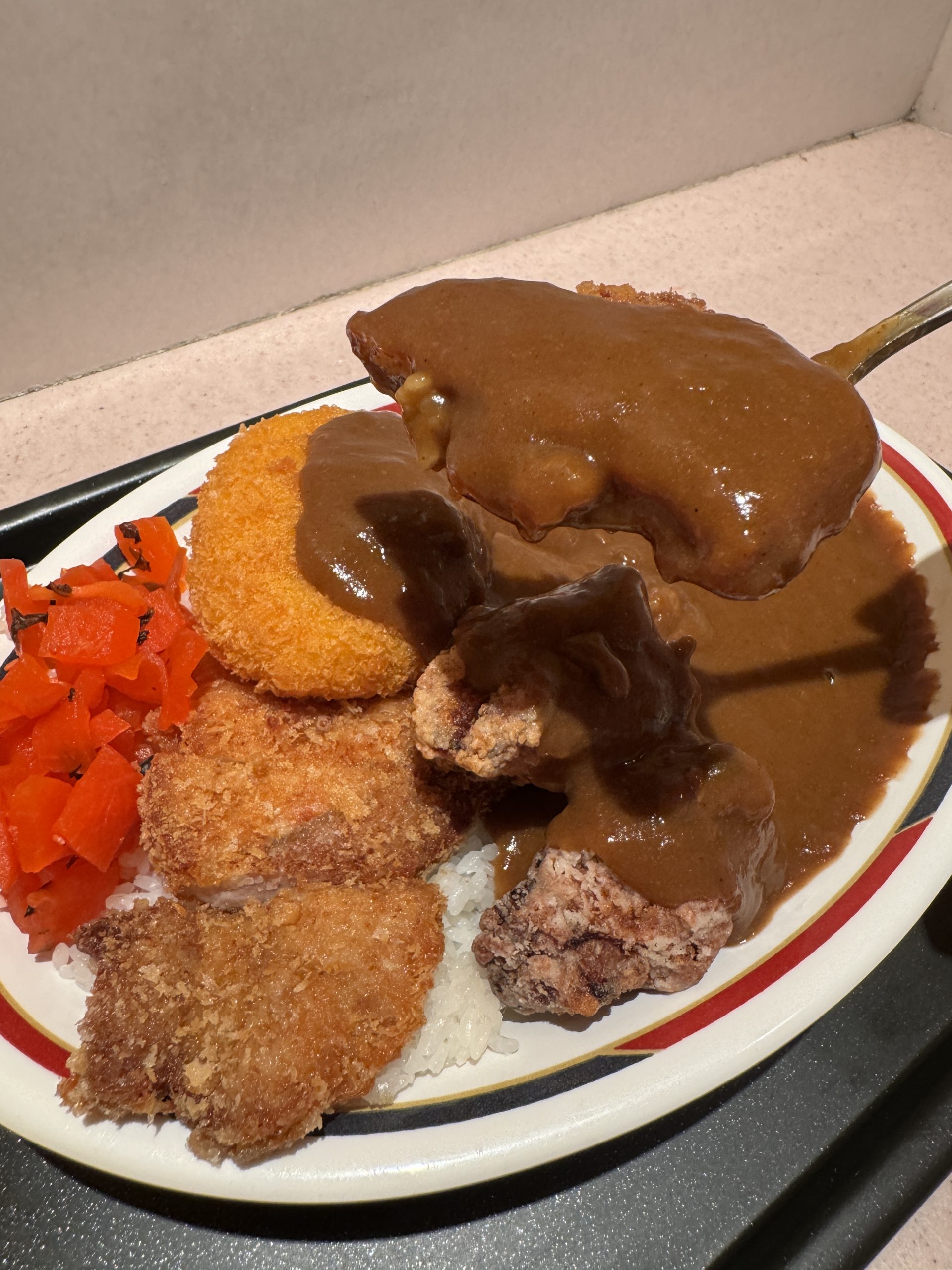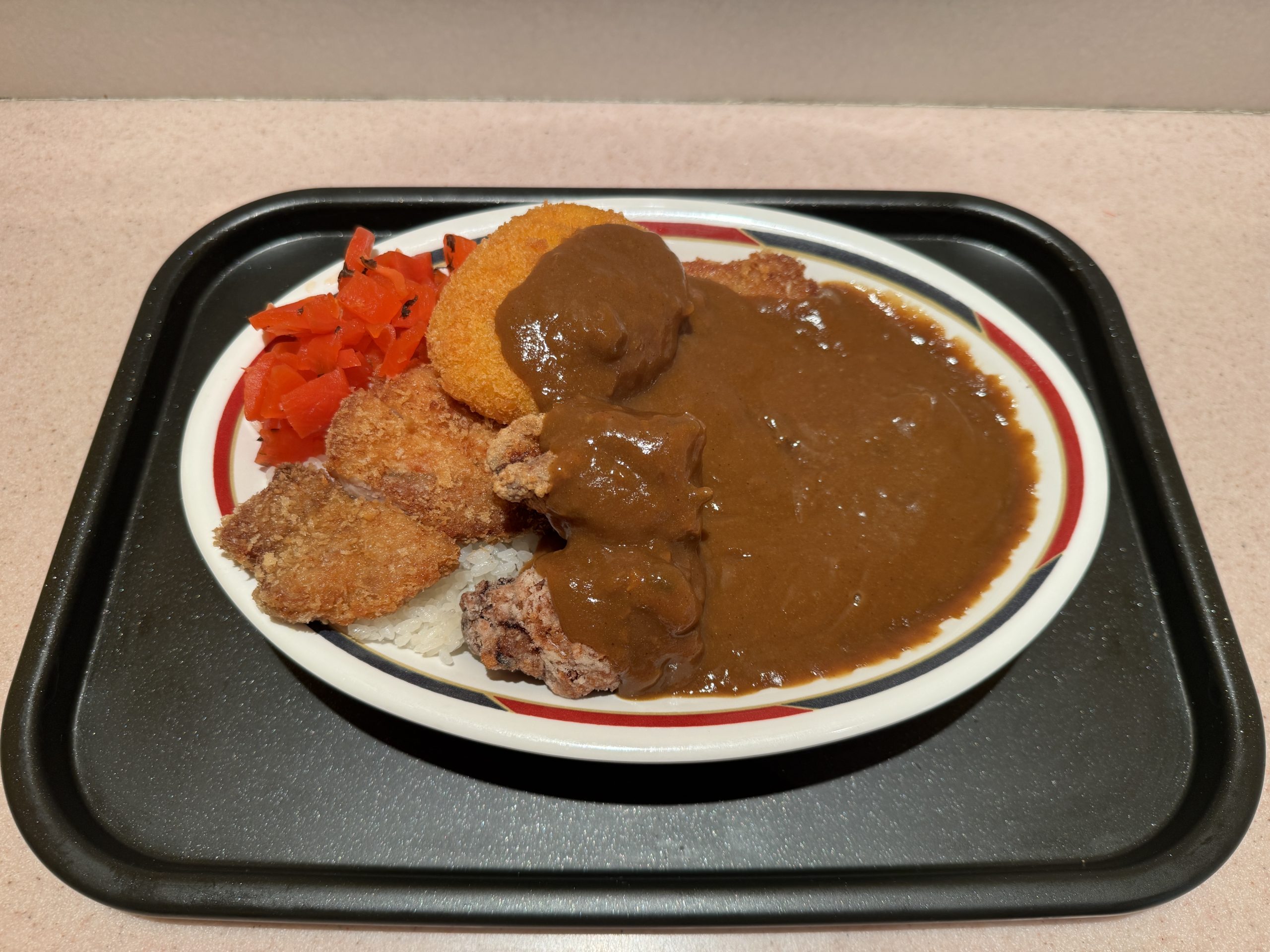 ウホッ♪ かなり豪快なデカ盛り! 安いからと言ってライス量が少ないわけではありません。しっかり大満足の大ボリュームです。カレーをたっぷりとまとったカツ、コロッケ、から揚げは至高。