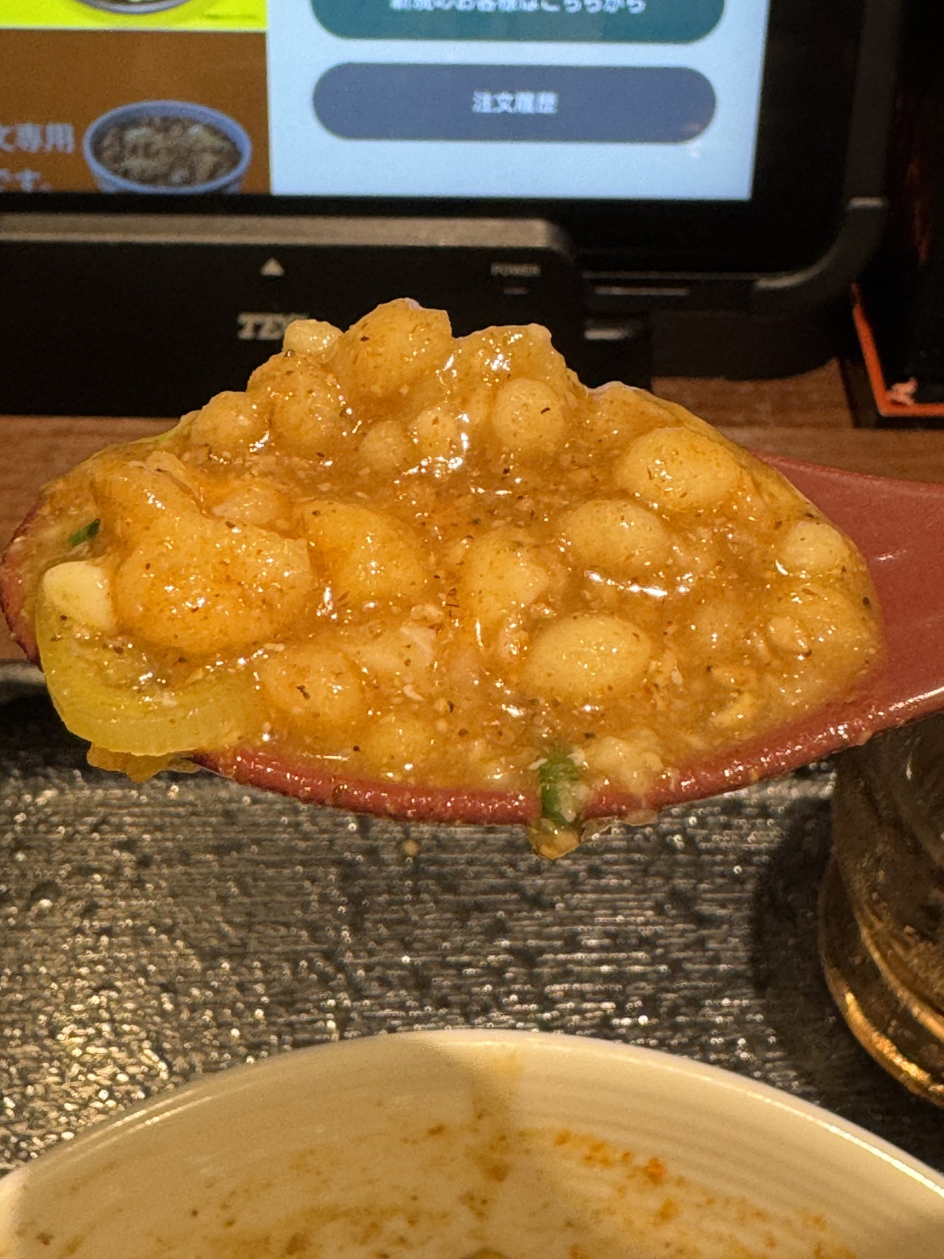 ちなみに、麺と具を食べきったら、スプーンで「揚げ玉とスープ」をすくって飲んでほしい。これがまた絶品。和風スープとしても秀逸なデキ。最初から最後まで楽しめる、ステキな「牛玉スタミナまぜそば」といえよう。