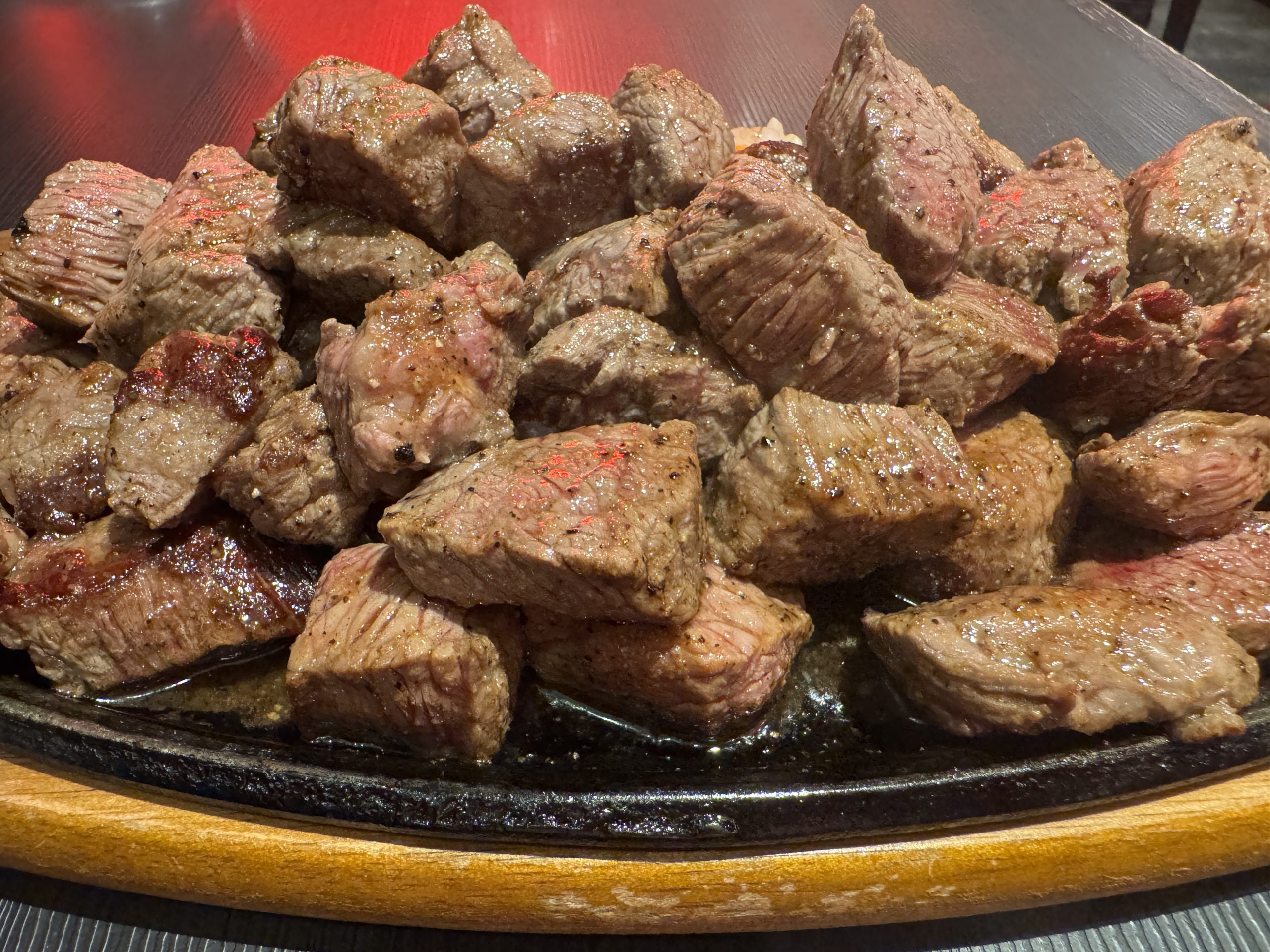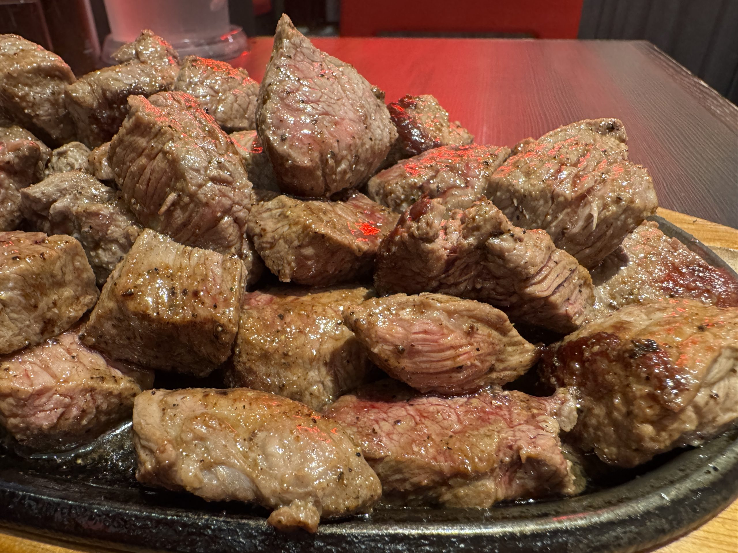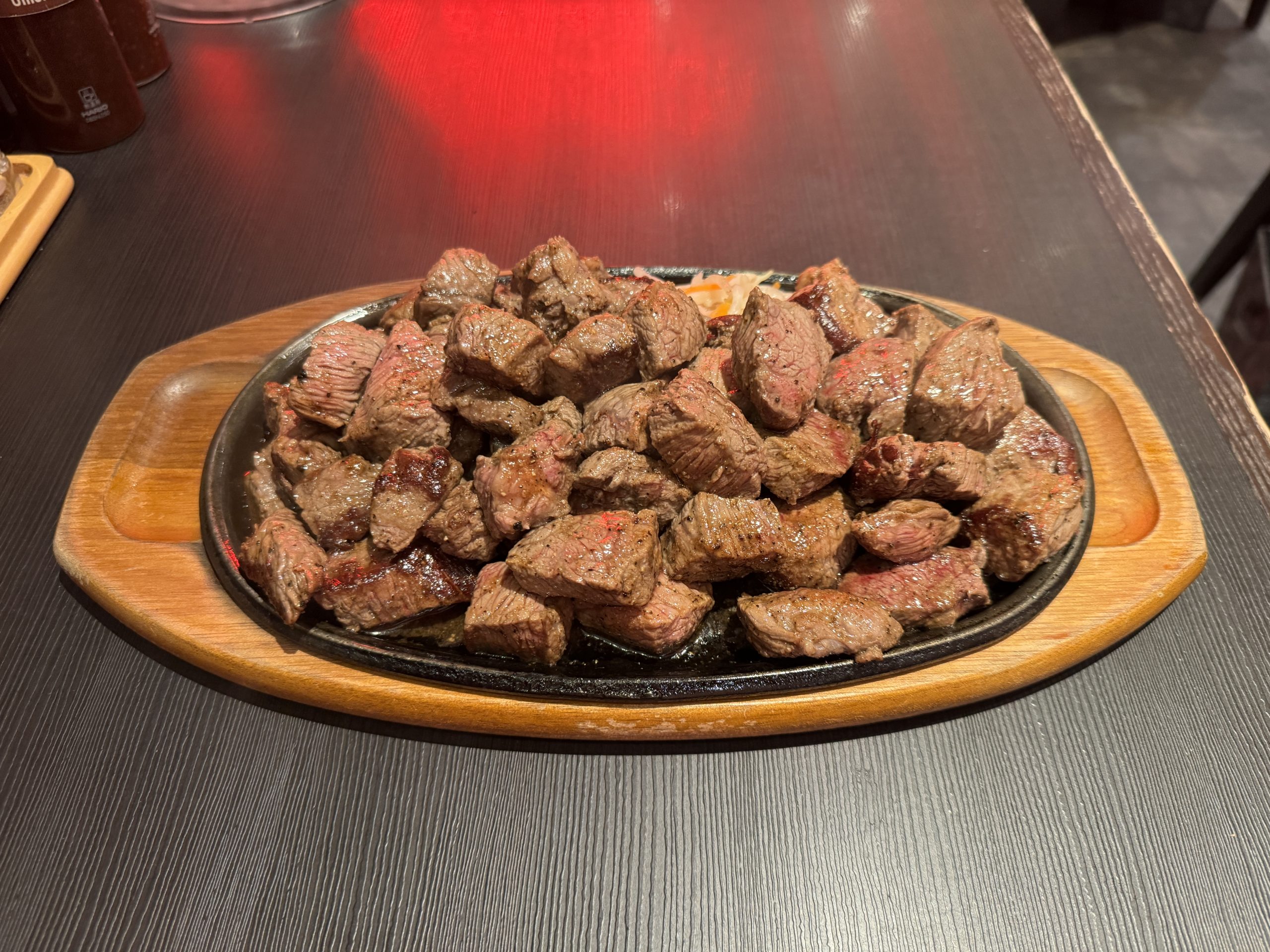 サイコロステーキのような肉がゴロゴロとプレートに盛られています。まるで山、いわゆるマウンテン。モヤシが添えられていますが、肉が多すぎて見えにくいです。