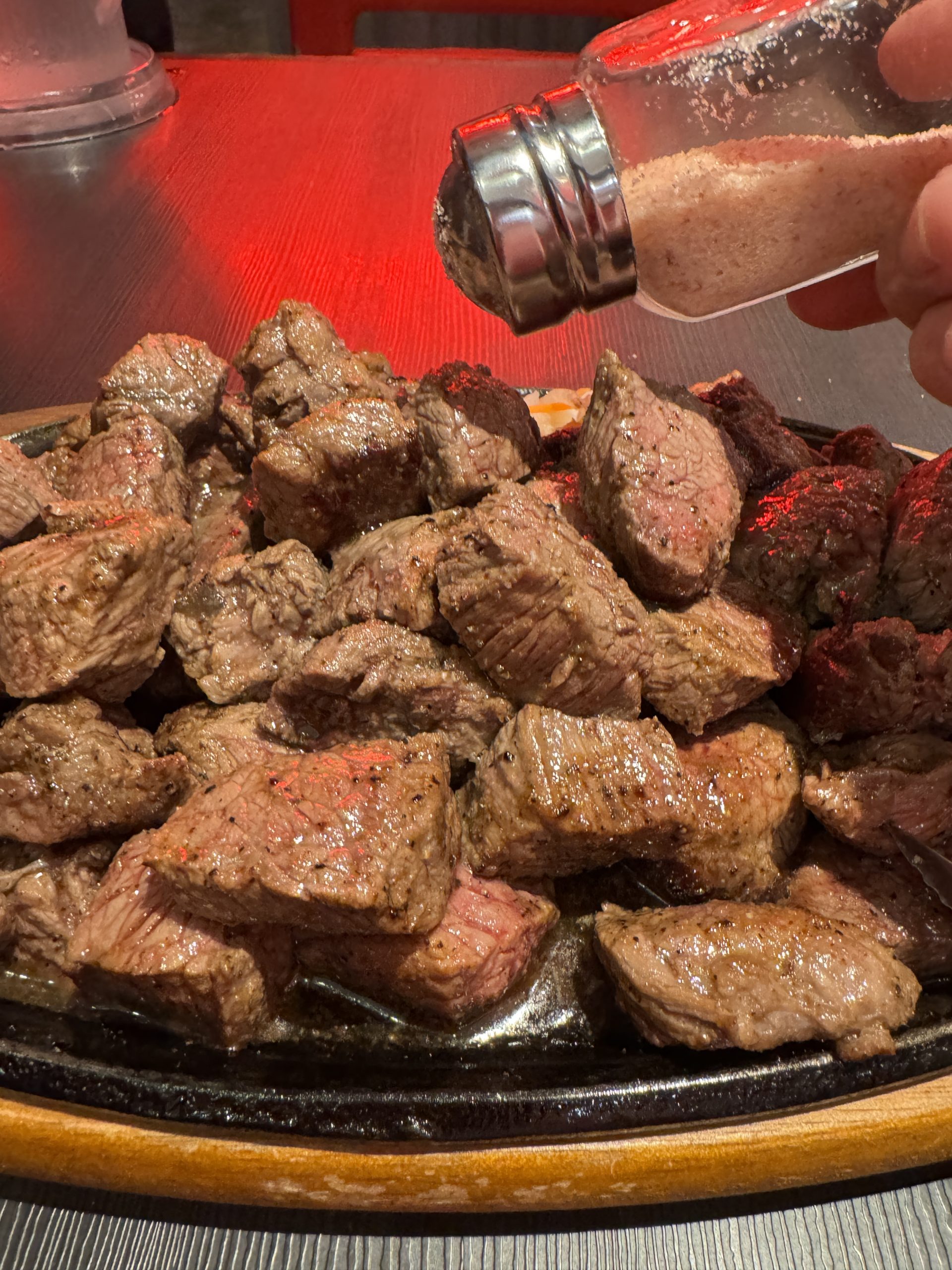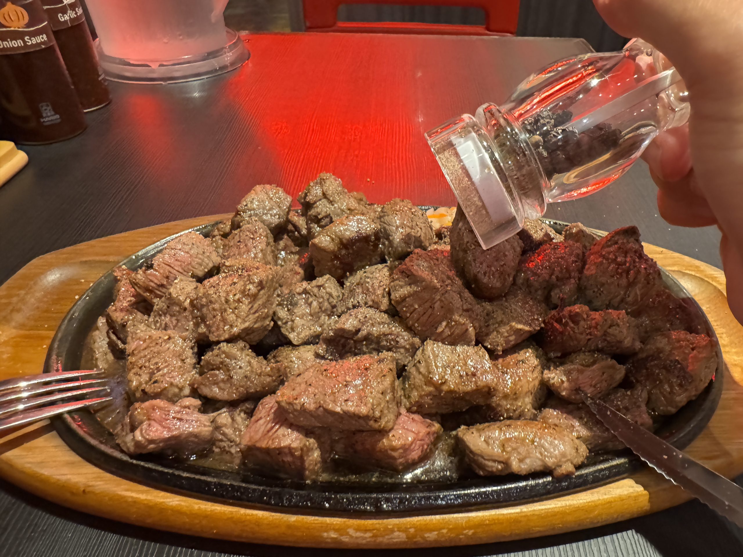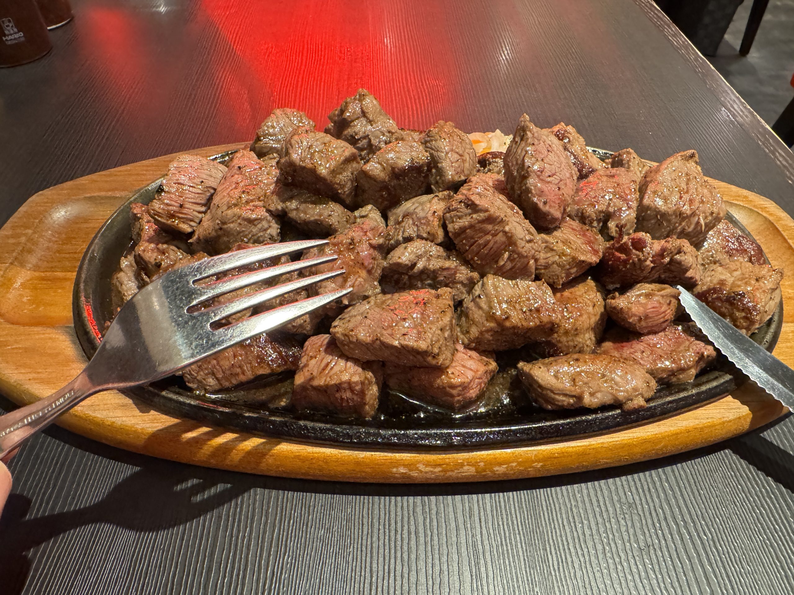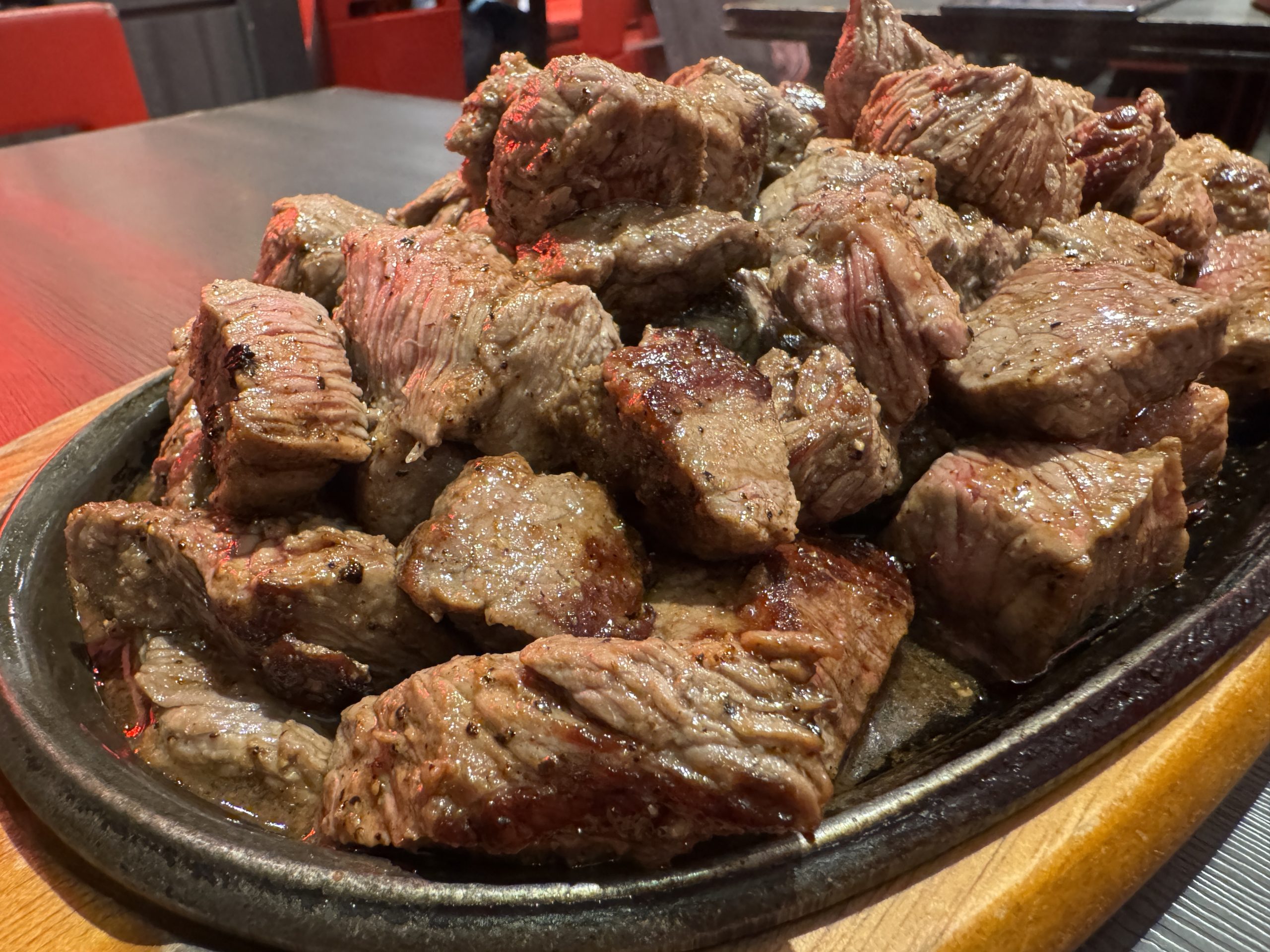 サイコロステーキのような肉がゴロゴロとプレートに盛られています。まるで山、いわゆるマウンテン。モヤシが添えられていますが、肉が多すぎて見えにくいです。