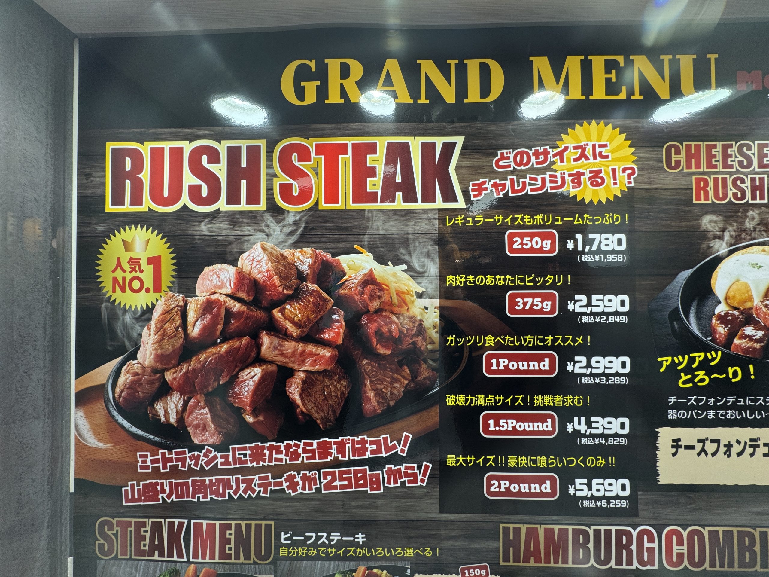 お店のメニューを見てみると、大量に食べられるステーキがありました。ラッシュステーキ! 2ポンド! 約900グラム! ほぼ1キロ!