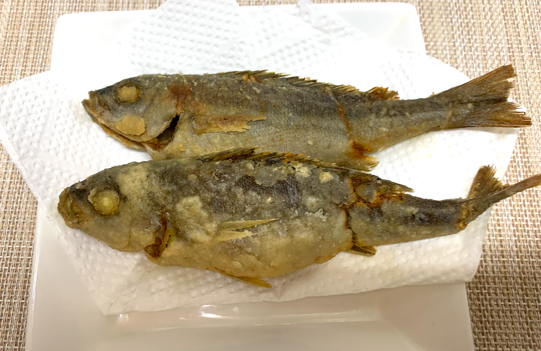 まず10cmぐらいの大き目の個体は背骨とヒレが硬くて危険! 手間ではありますが、ちゃんとヒレを取り、開いて、背骨までサックリ揚げる必要があります。