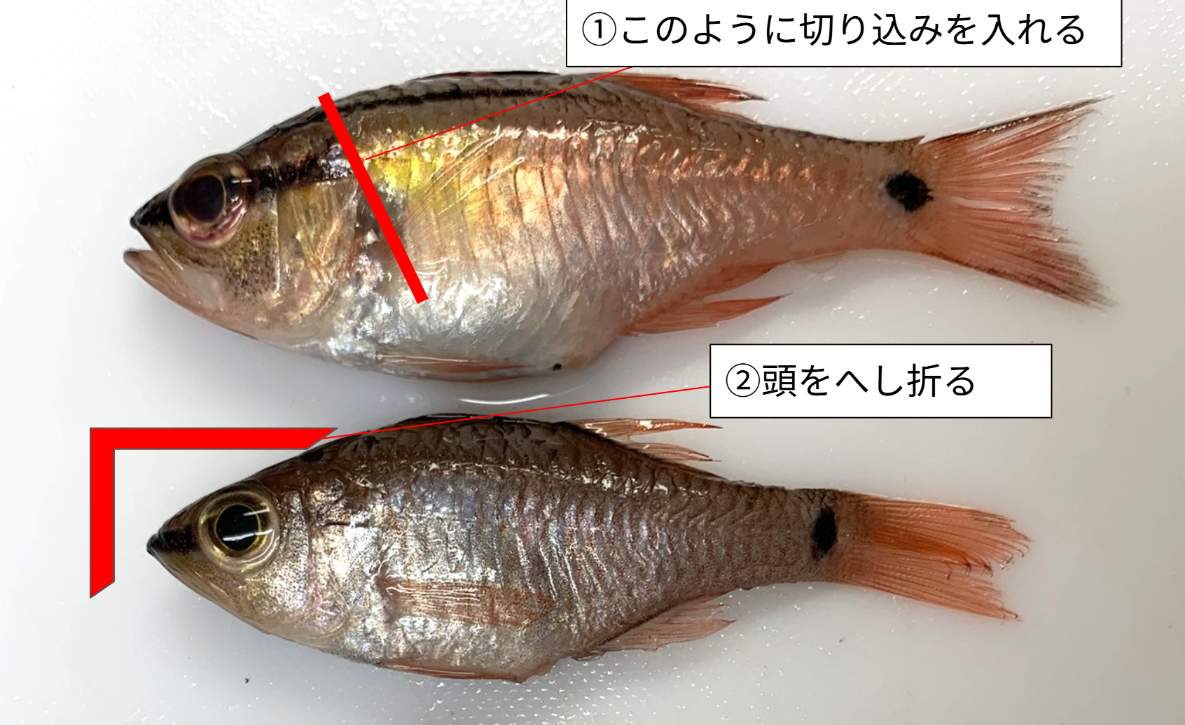 ちょっと手間ですが、イサキやネンブツダイなど、ヒレが硬い子はハサミでヒレをチョキチョキしたほうが良いです。