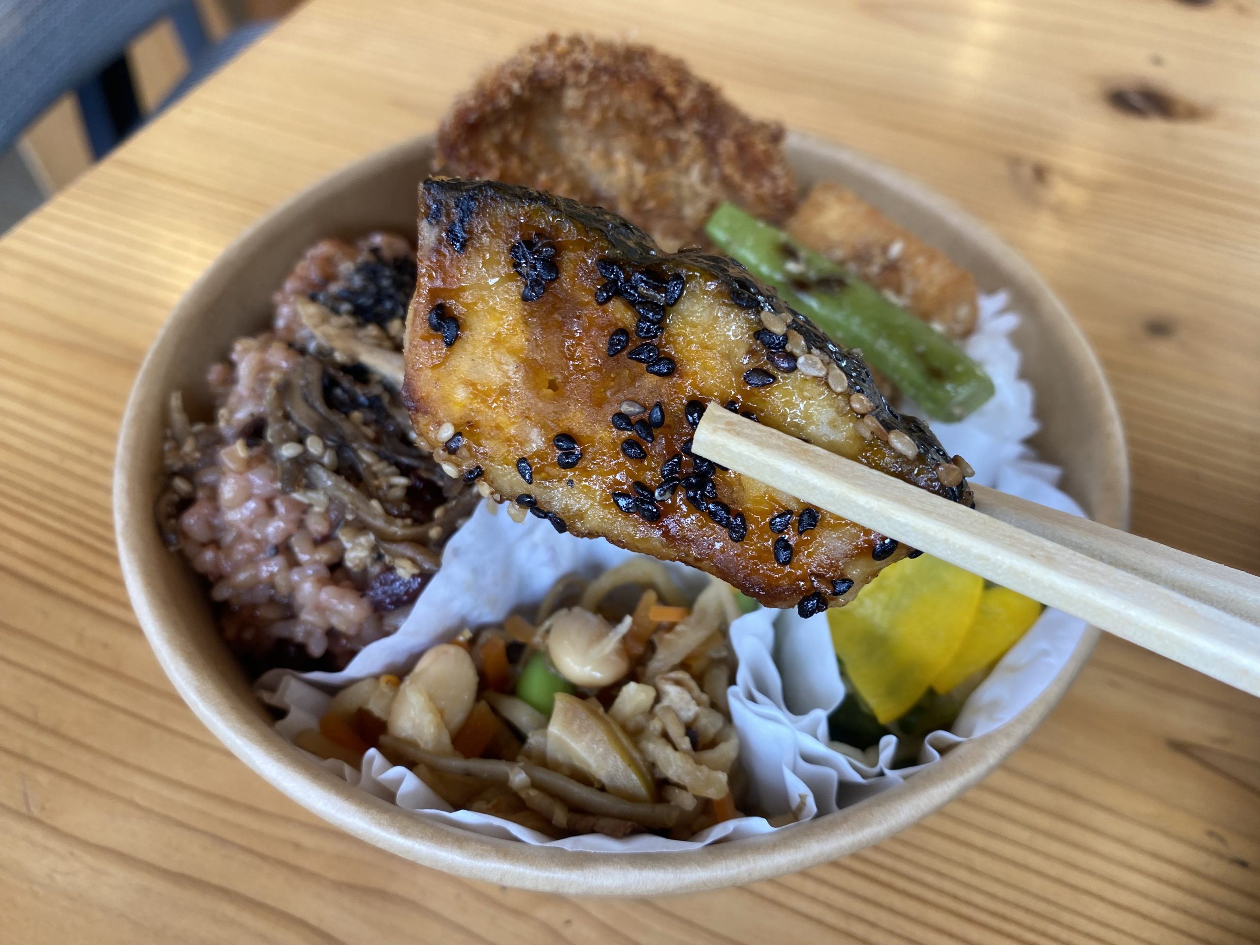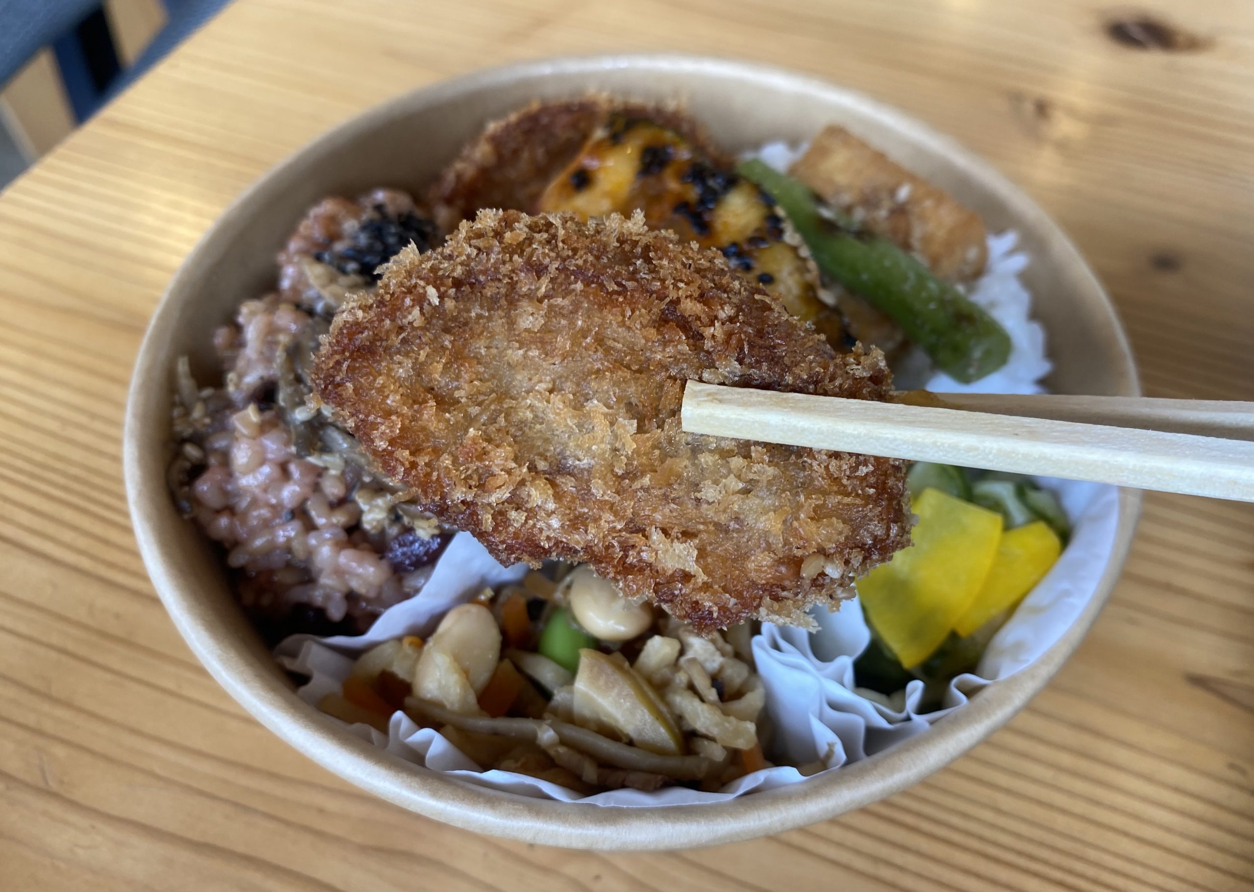 ▲筆者の推しは「車麩(くるまふ)のフライ」! お麩と思えない食べごたえ。ごはん(ちなみに唐津産の自然栽培米を使った発酵玄米です)との相性もバッチリ。