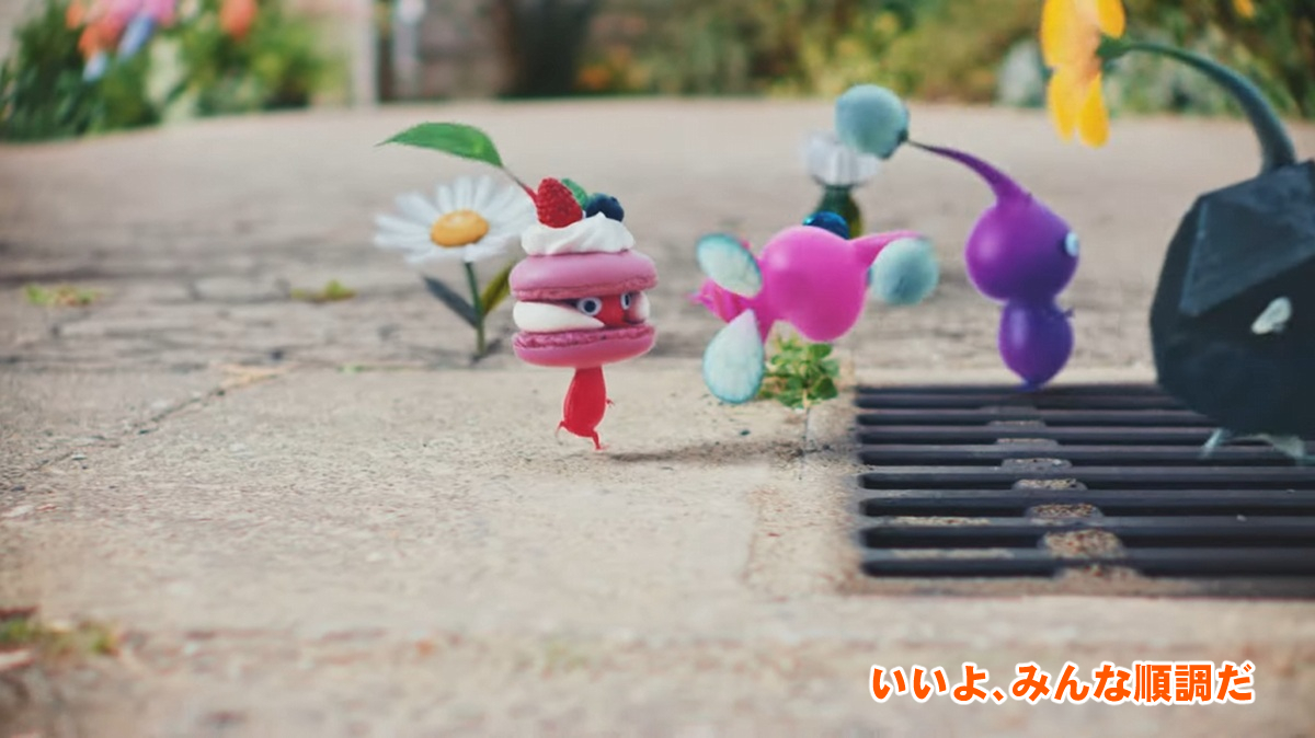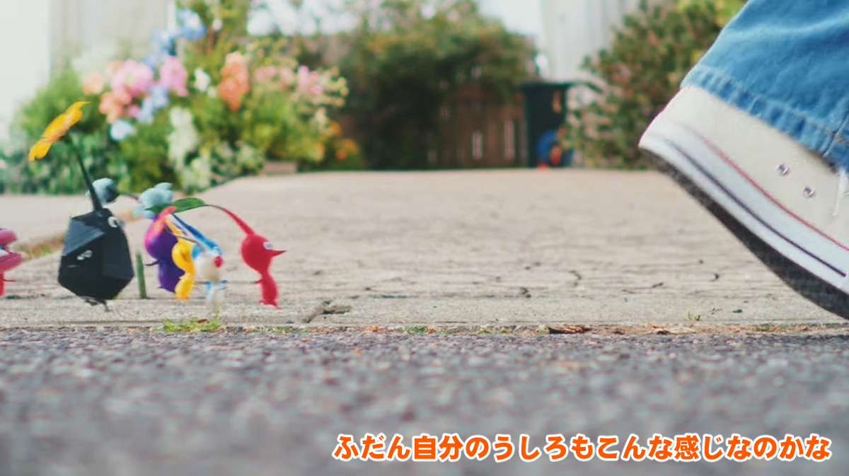花植えをしながら歩くプレイヤーを追いかけるピクミンたちという本作ならではのシチュエーションで動画がスタート。