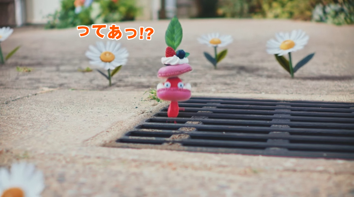マカロンを付けた赤デコピクミンが排水溝の隙間に引っかかってしまう大ピンチ。