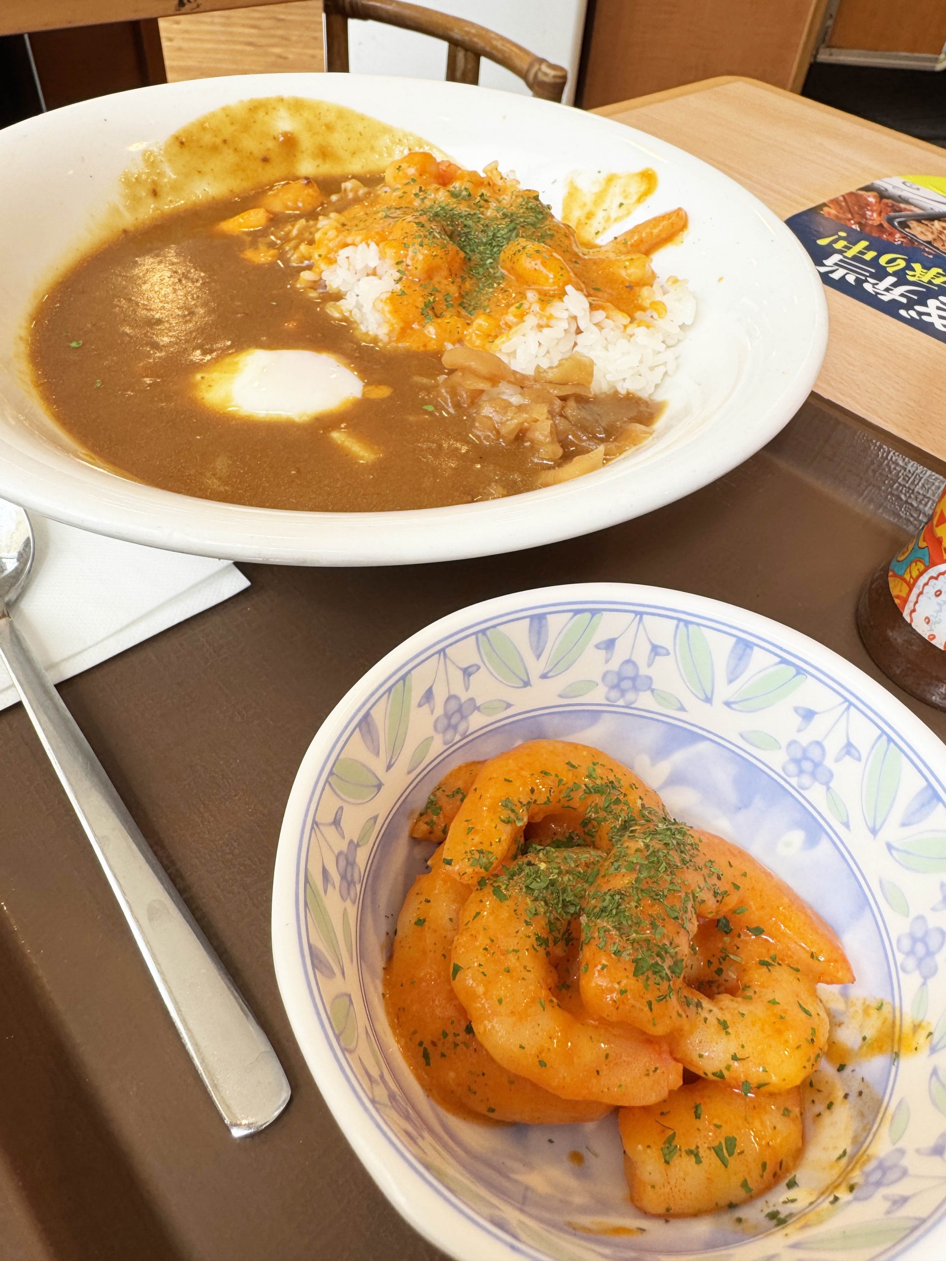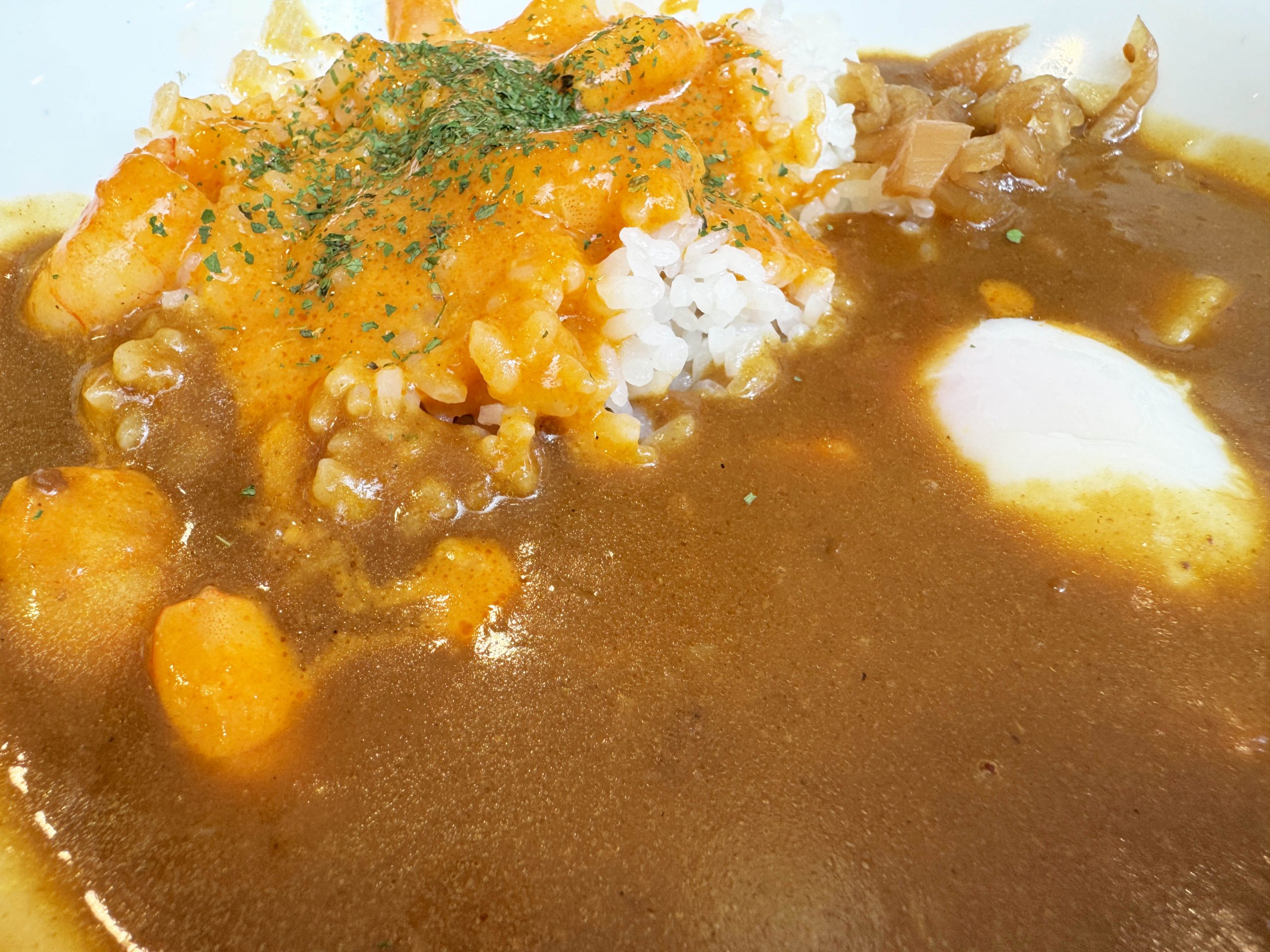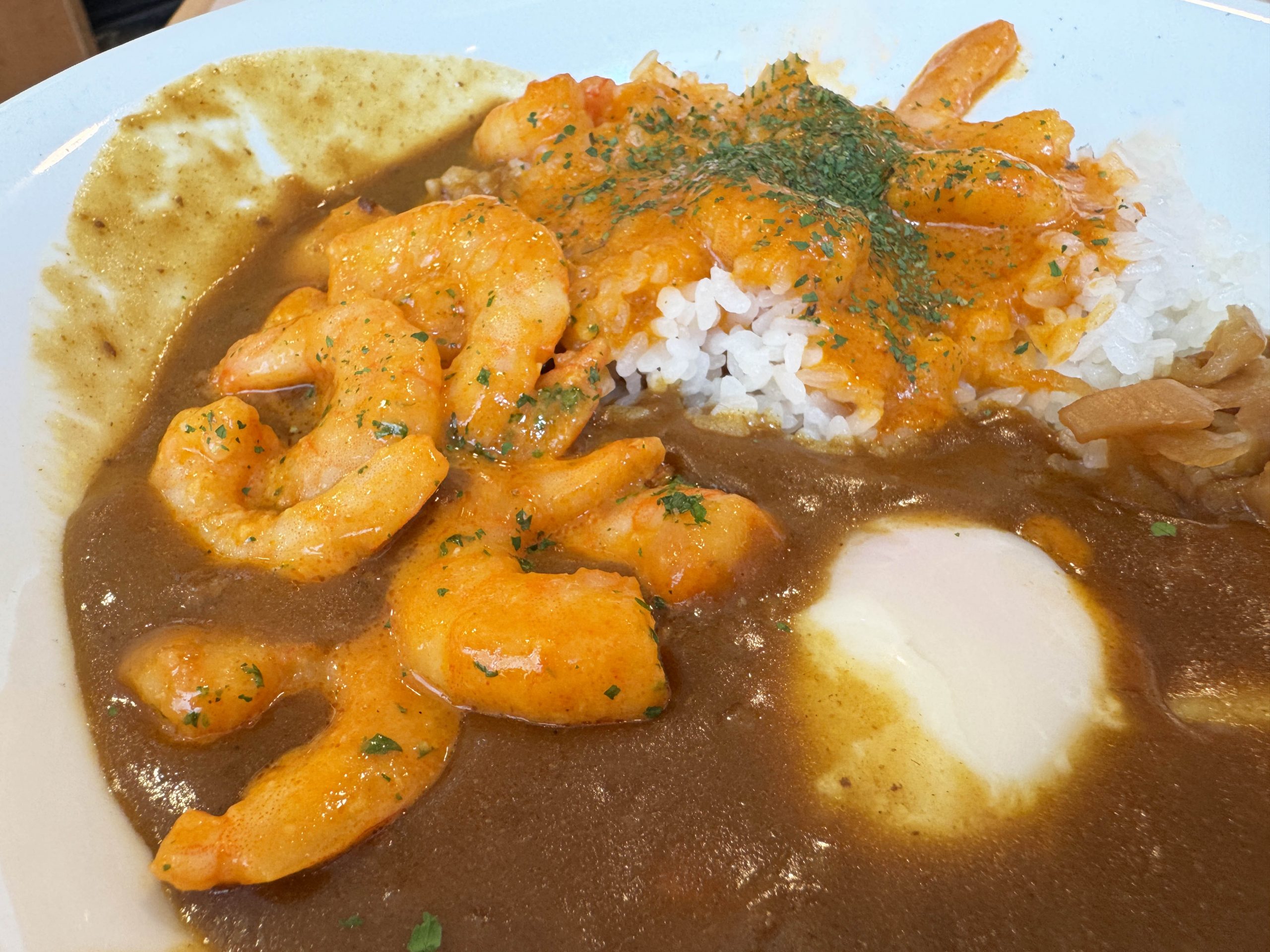 ということで、ぷりぷりえびのビスクカレーをオーダーしてみました。温玉付きです!