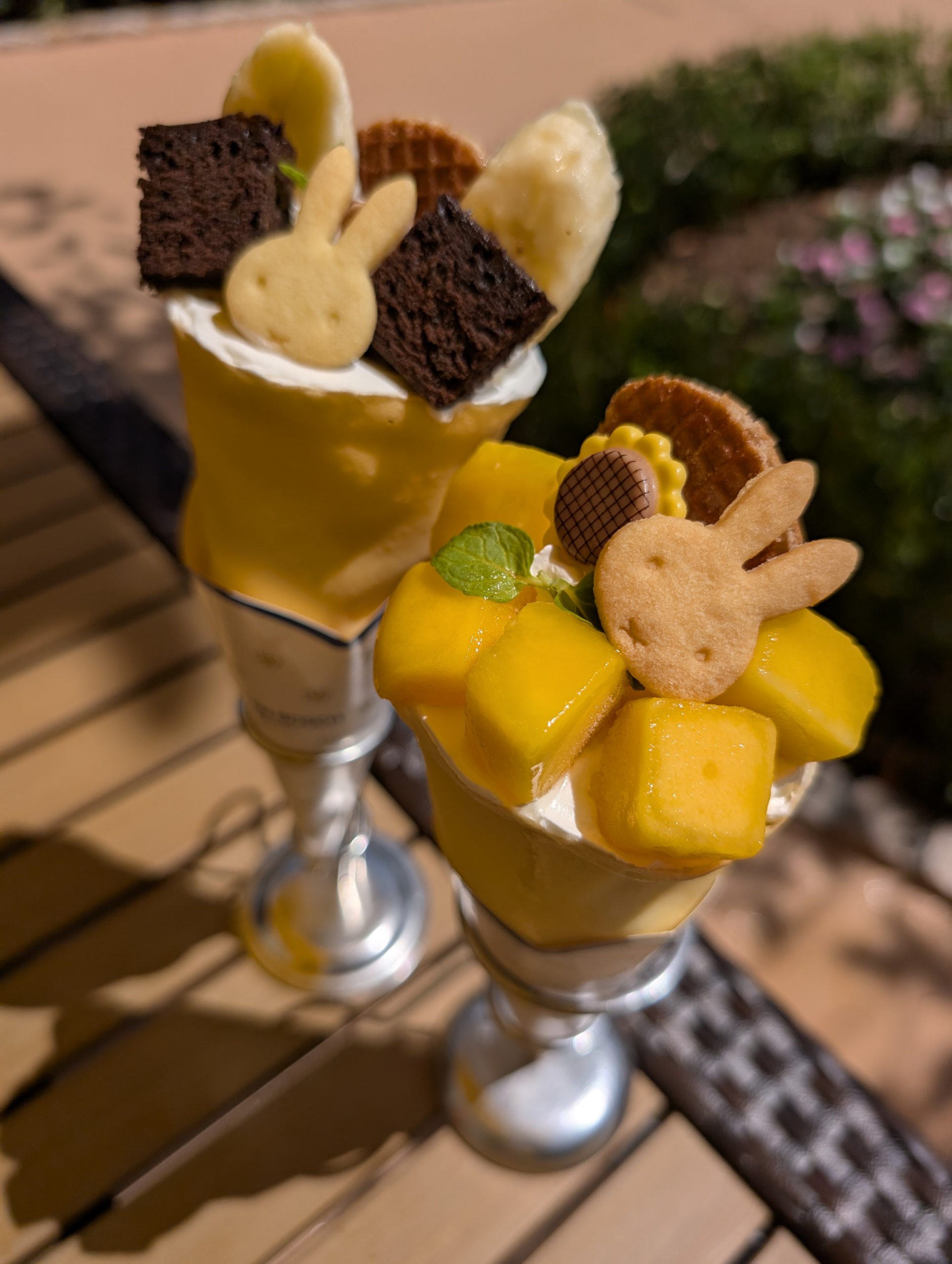 デザートには、「ミッフィーのマンゴークレープ」や「ミッフィーのチョコバナナクレープ」はいかがでしょうか。ミニブーケをイメージしたクレープで、お味は2種類。マンゴー950円、チョコバナナ900円。(※取材撮影用に特別にスタンドを使用しています。通常は付属していません)