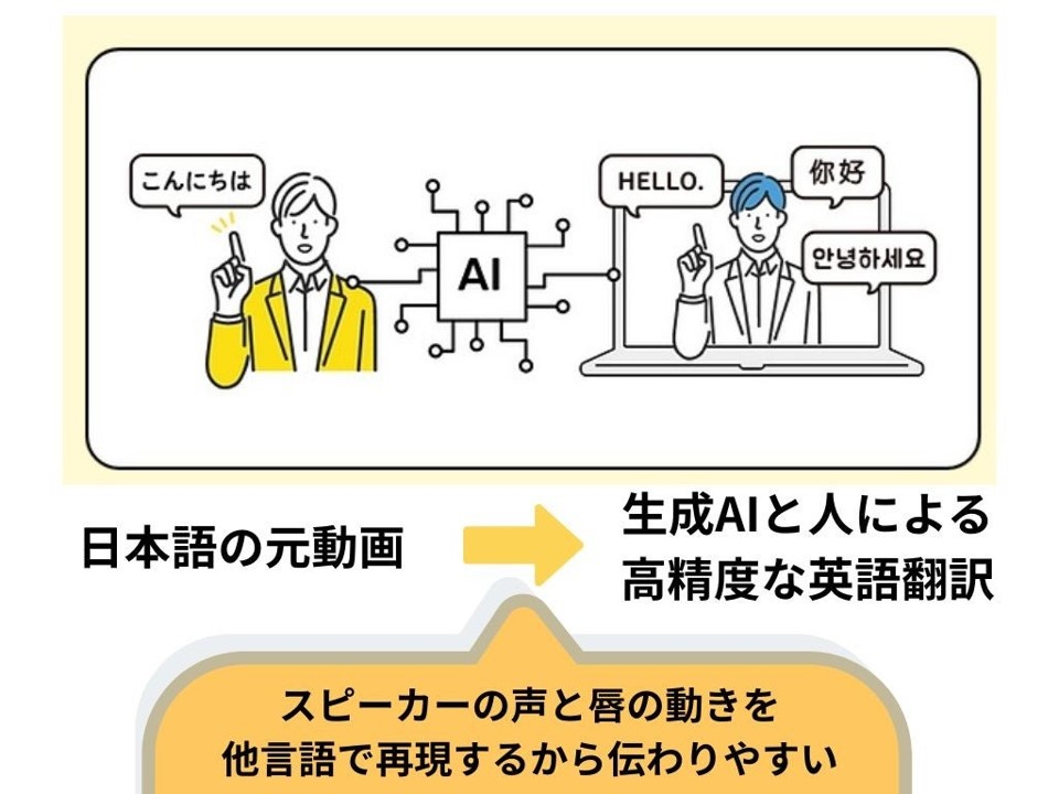 他言語動画翻訳サービス「こんにちHELLO」も動画生成AIを活用したビジネスの一つです。