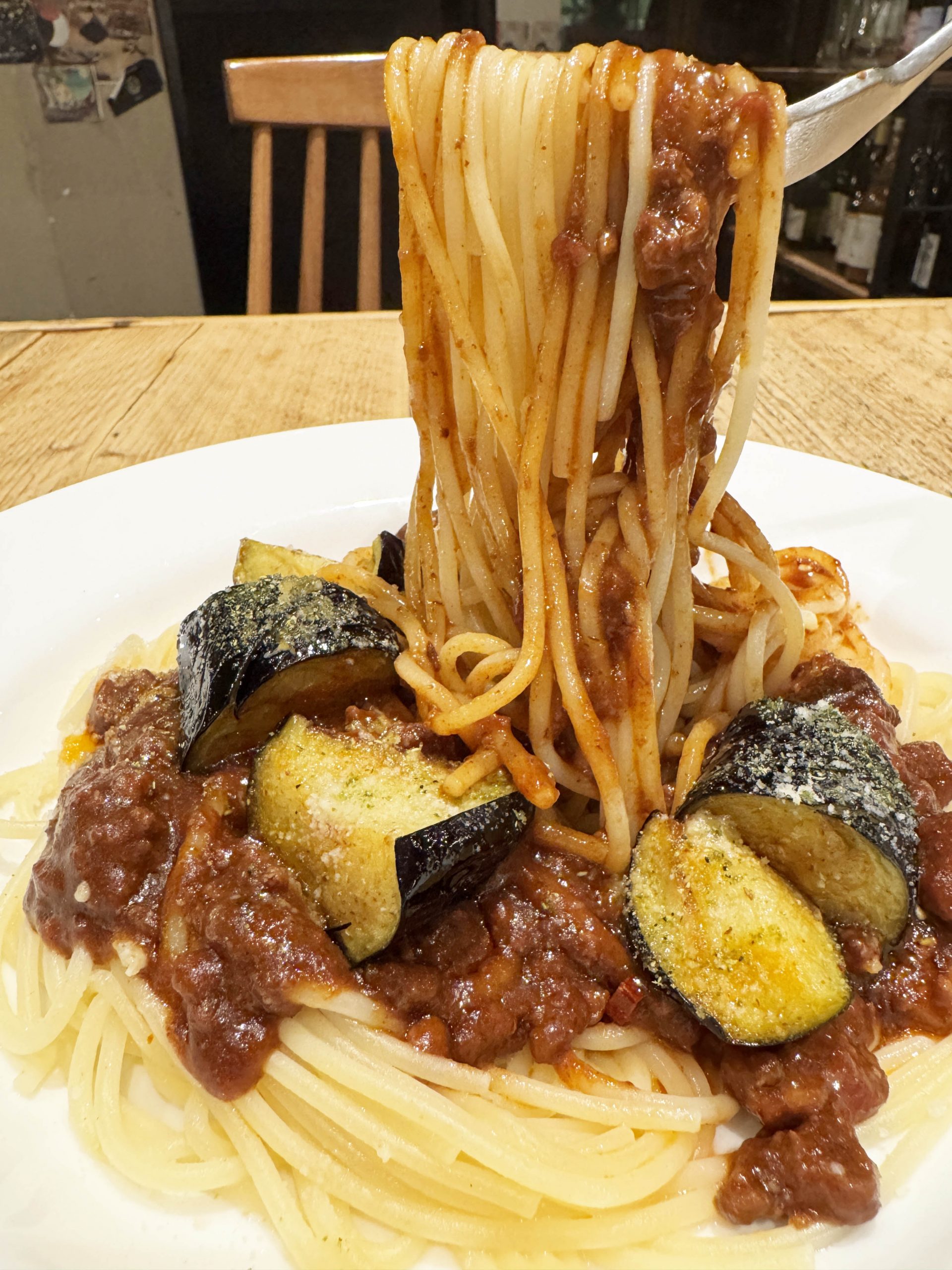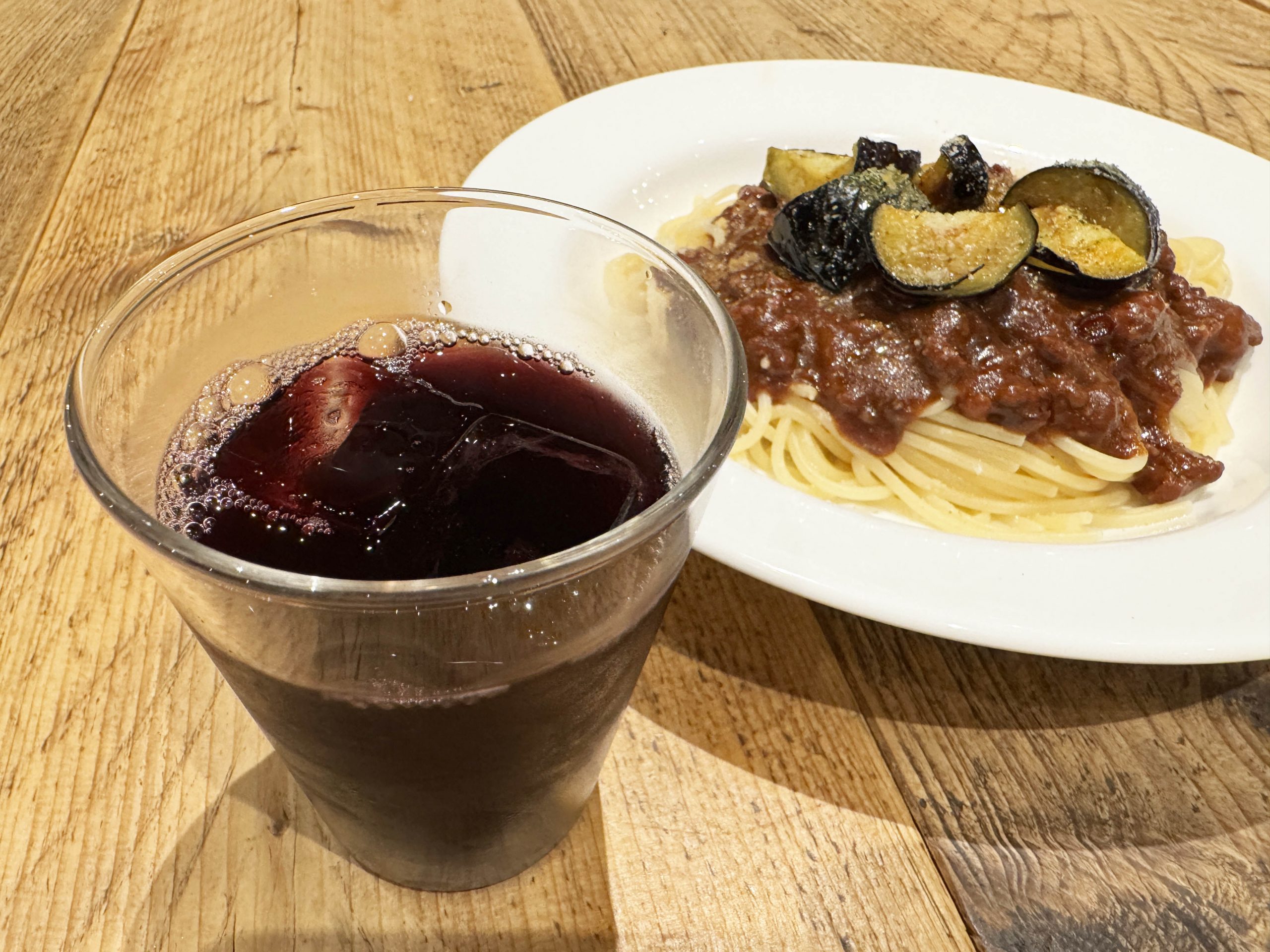 目の前にやってきたコクミート。そして葡萄ジュース(ワインが飲みたかったけど仕事があるので我慢しました)。自家製ミートソースの上に、ゴロッとダイナミックにカットされた揚げナスが盛られています。そして、湯気からマーラー的な薫りがします。これは絶対にウマイやつ。そう確信させる刺激的だけど心地よい薫り。