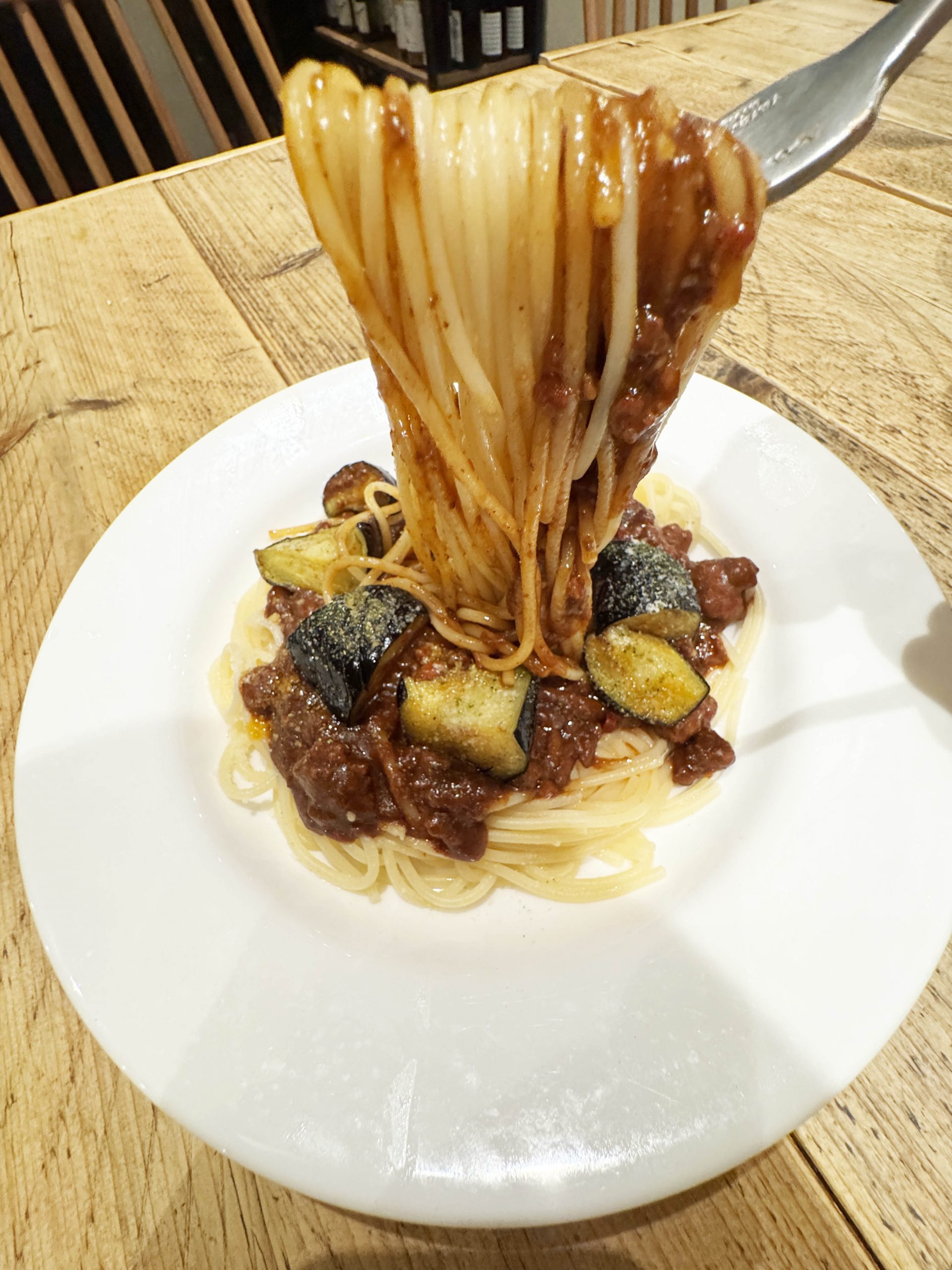 ガッツリと自家製ミートソースを混ぜるのではなく、やや豪快に、そして混ぜすぎず、ザッザッ! とパスタにからめて食べます。そうすることで、テイストにグラデーションと緩急が生まれて味覚が楽しいのです。その味は……、これは革命の味ですよ。