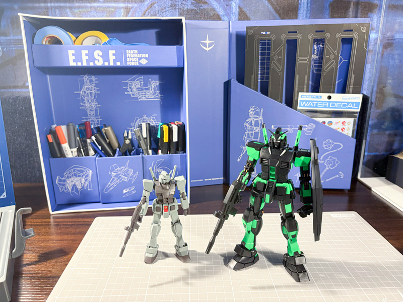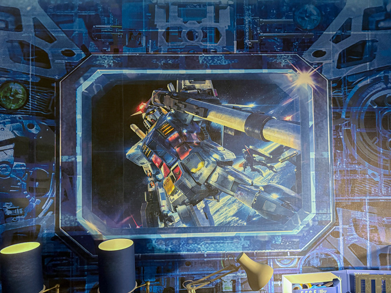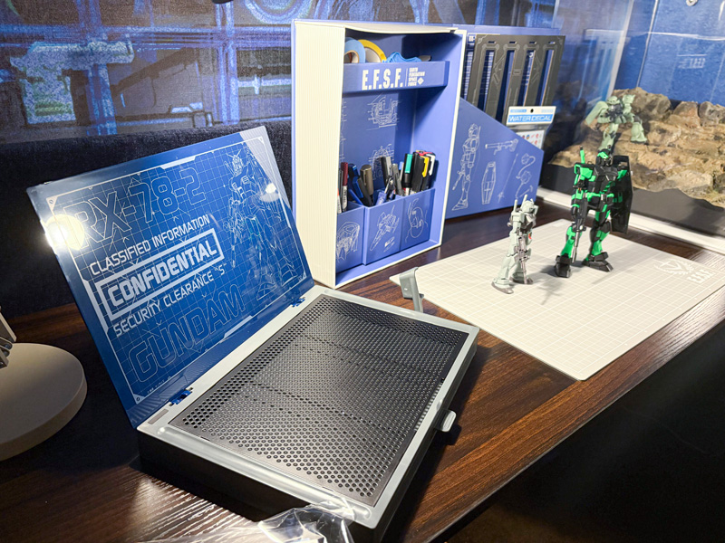 本企画のためだけに制作した壁画のマーキングデザインに、コックピット型のデスクやガンプラのモデル展示など、ファンの心をくすぐる空間と楽しい仕掛けが盛り沢山。専用工具もずらっと並び、滞在中は思う存分ガンプラづくりに没頭できる環境となっている。デスクの周辺にはジオラマ作品が展示されているので、完成したガンプラを飾って撮影しよう。