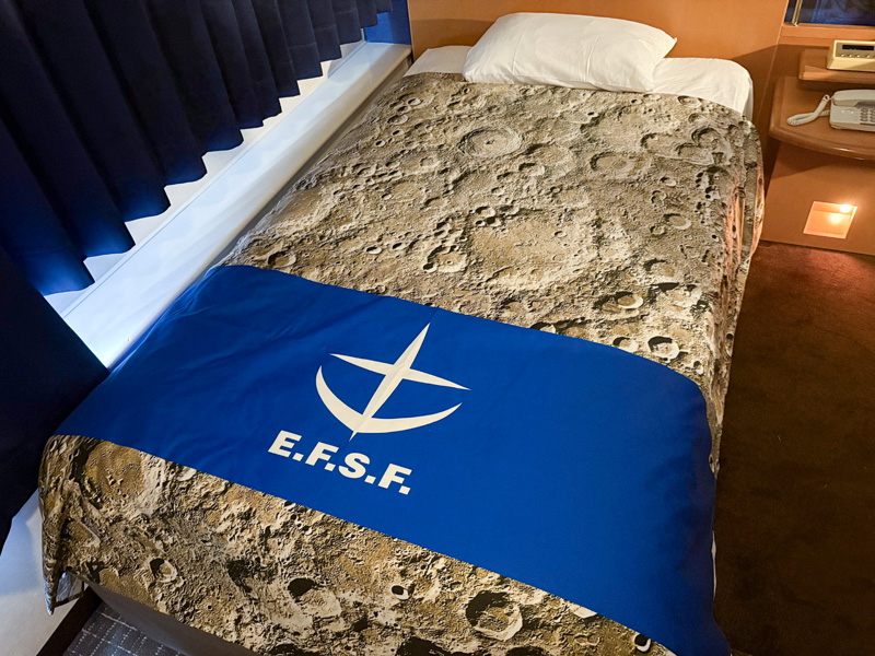 月面デザインのベッドカバーに、地球連邦軍のロゴマークも。