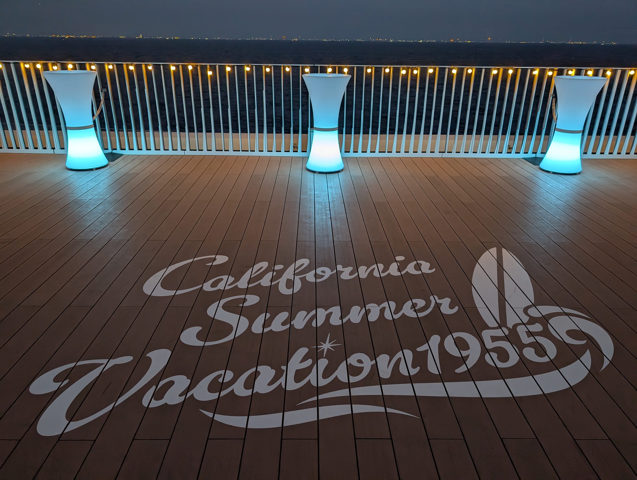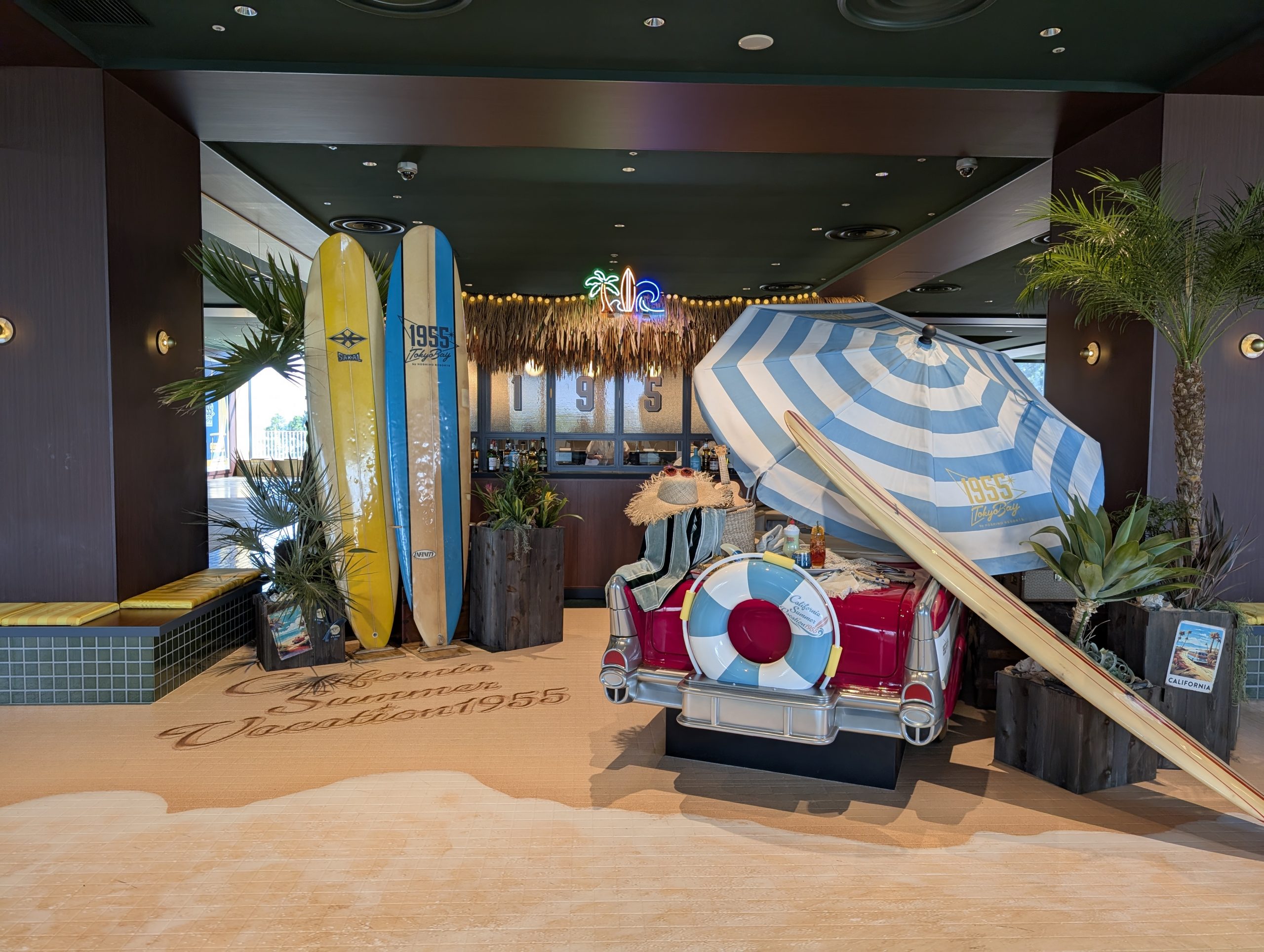 15時。ホテルに向かいました。ホテルでは現在、初開催のイベント「California Summer Vacation1955」を期間限定で開催しており、1950年代のサーフカルチャーを感じさせるフォトスポットがエントランスに登場しています。茅葺風の屋根が付いたコンシェルジュデスクは、当時流行していたカリフォルニアのバーをモチーフ。到着早々楽しい気分になります。
