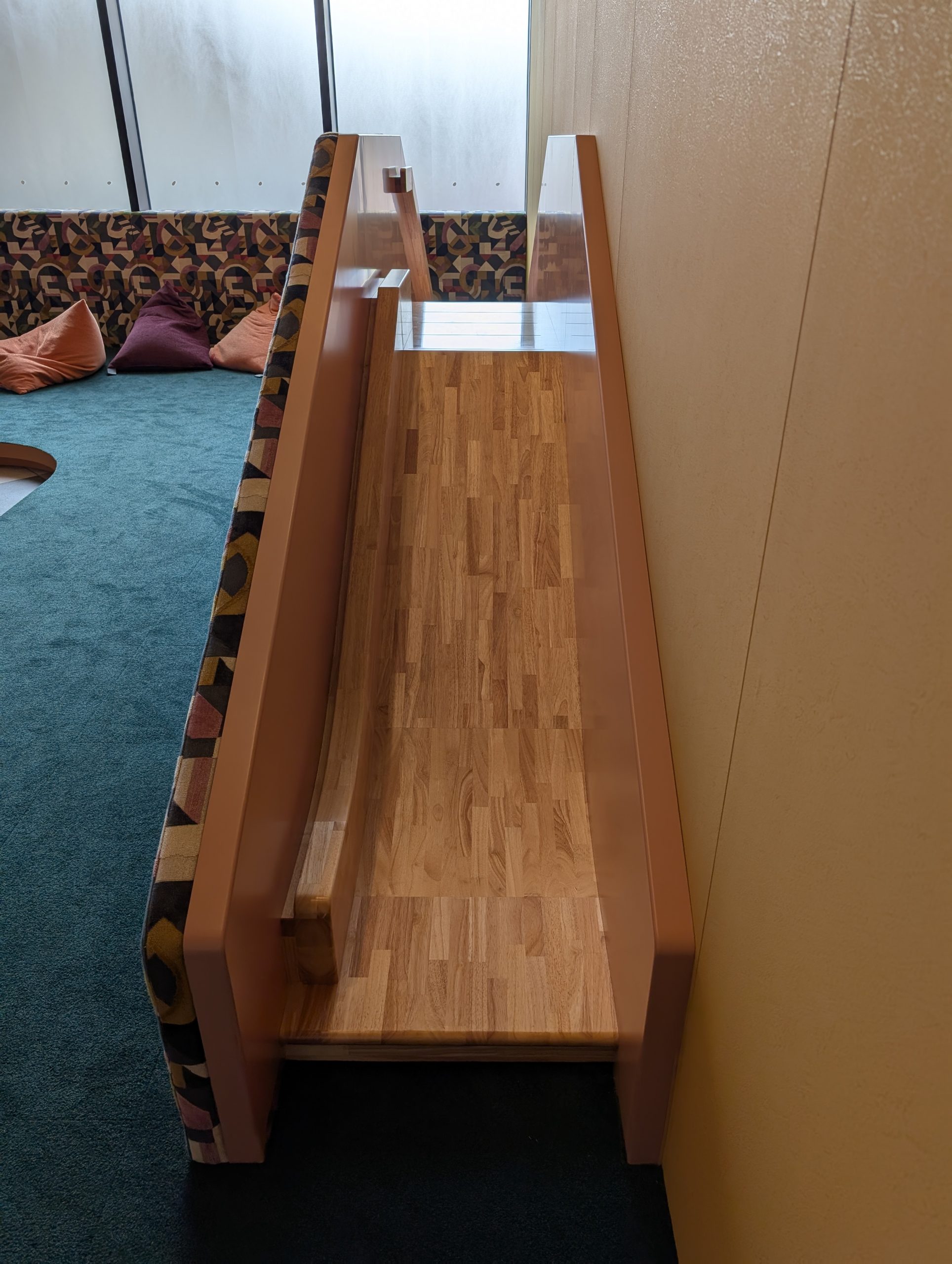 なんとすべり台が! 絵本を読んで過ごしたり、すべり台でアトラクション気分を味わったり、思い思いに過ごせますよね。しかも屋内なのでとても快適。また、子どもが靴を脱いで遊べるだけでなく、親御さんもアイランドソファーに腰かけて近くで見守ることができるので安心です。