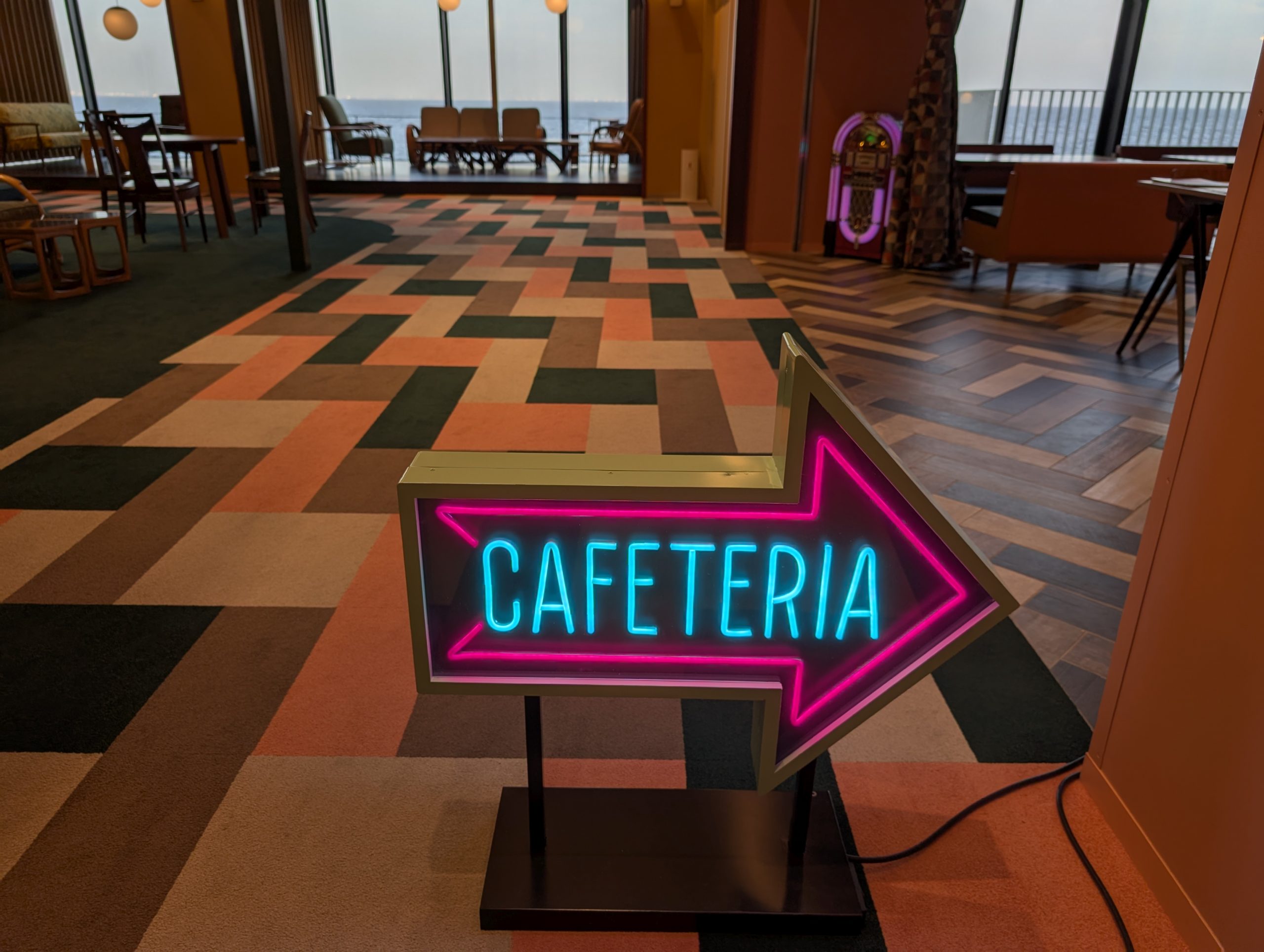18時。営業時間になりました。夏の期間限定メニューをいただくため、「Cafeteria」へ移動。新しい看板がありました。23時まで営業中。