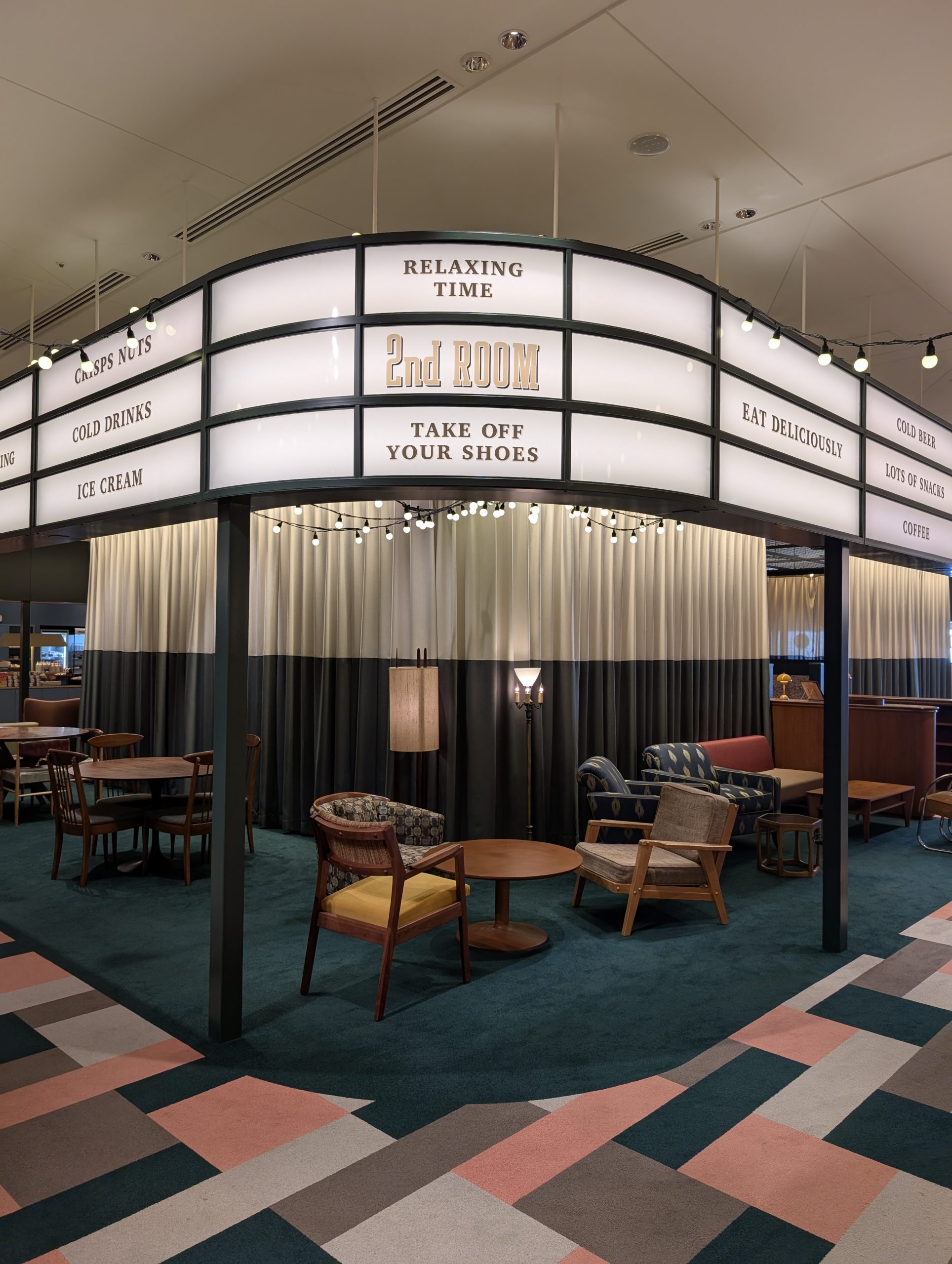 「2nd Room」の入口です。まるでアメリカの映画館のような看板が出迎え、これから始まる旅の物語を感じさせるデコレーションです。