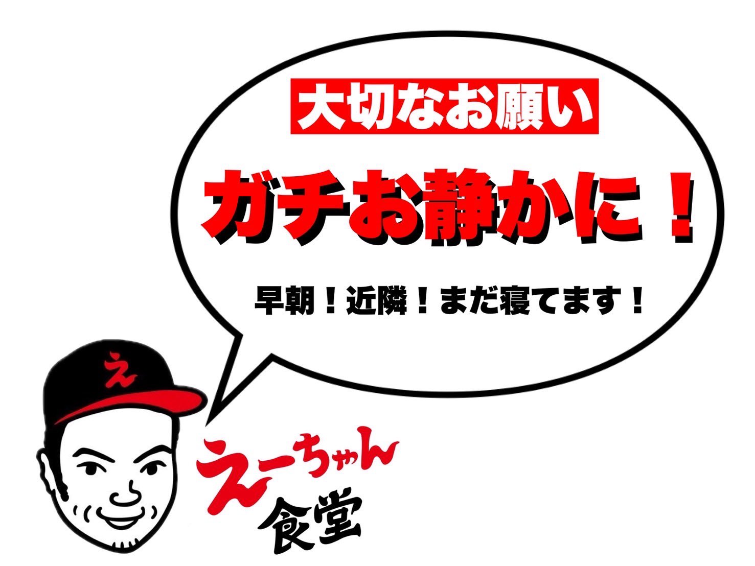 「えーちゃん食堂からのお知らせ お引き取り願っても帰っていただけない場合は一旦営業を中断してお引き取りしていただいてからの営業再開にさせていただきます。その時並んでいるお客様にはご迷惑おかけしますがご理解いただけると幸いです。一旦警察の方を呼んで話し合う時間にさせていただきます」