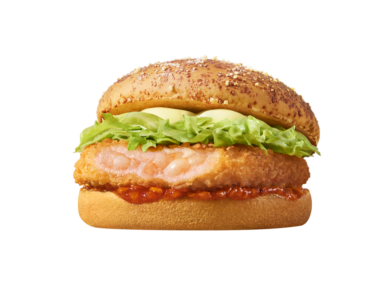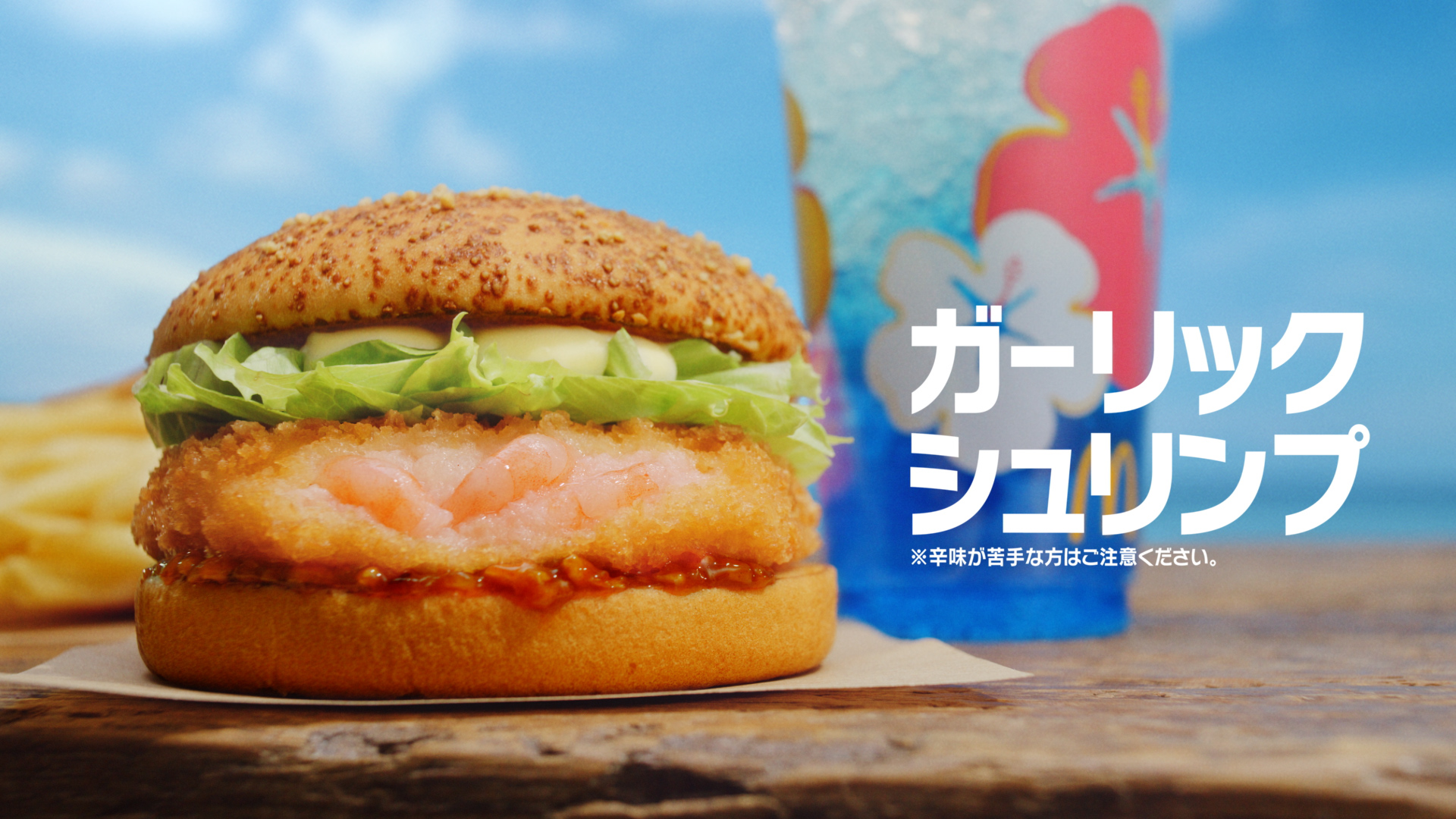 「ザクザクの衣とぷりぷりのえびの食感が特長のえびカツに、サクサクとしたフライドガーリックの食感が楽しいピリ辛の特製ソースを合わせ、粉チーズをトッピングした香ばしいオリジナルバンズでサンドしました。ロースト感のあるえびの旨みとガーリック風味のザクザクした食感が楽しめるスパイシーなソースが、ハワイの名物料理「ガーリックシュリンプ」を思わせる、夏にぴったりのおいしさをお楽しみください」