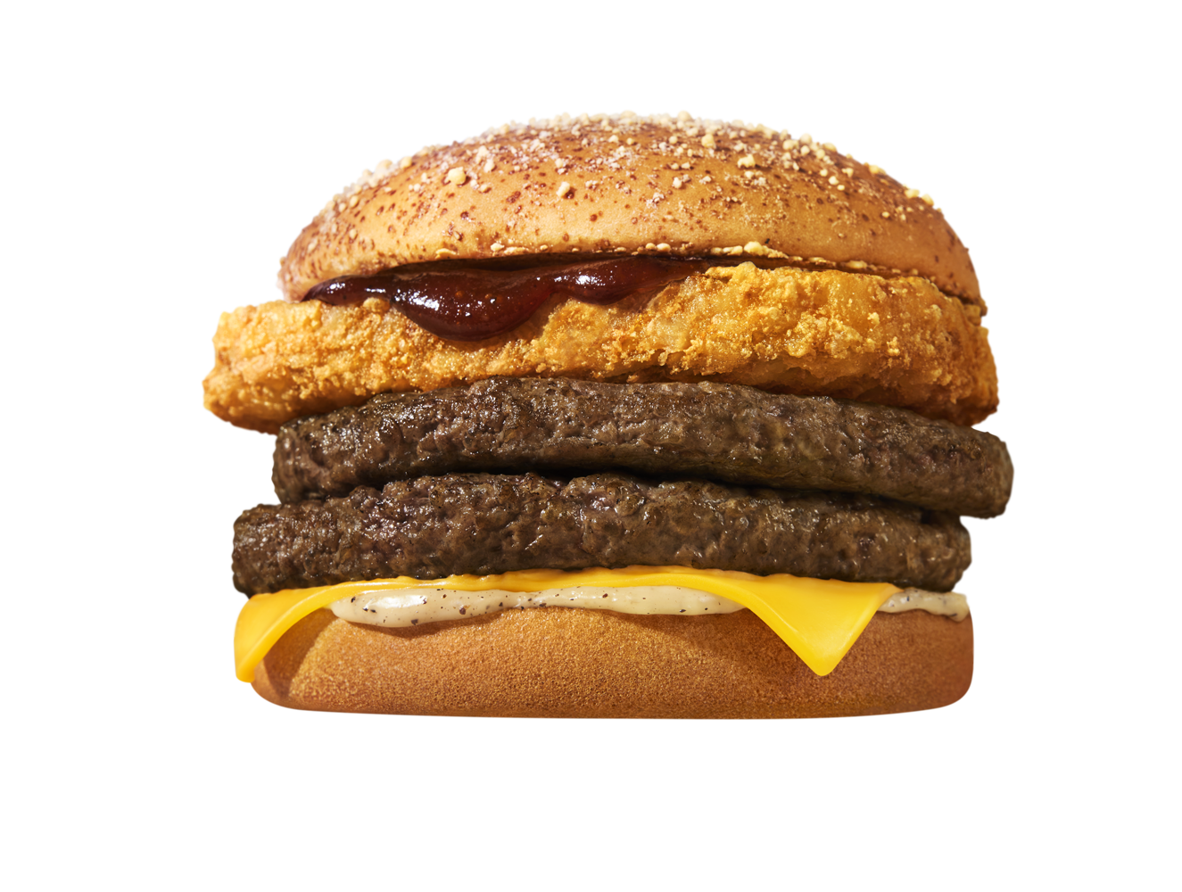 「夕方5時から限定! ジューシーでつなぎの入っていない、肉厚100%ビーフパティが2枚、さらに外はカリッと中はホクホクのざく切りポテトパティを重ね、粉チーズをトッピングした香ばしいオリジナルバンズでサンドした、ボリューム満点の一品です。ビーフエキスの見直しでよりコクのある味わいにリニューアルした特製ハワイアンバーベキューソースと、スモークチーズとブラックペッパーの味わいがやみつきになるスモークチーズペッパーソースが相性抜群の、食べ応え抜群のボリューム感と濃厚な味わいが特長の一品です」