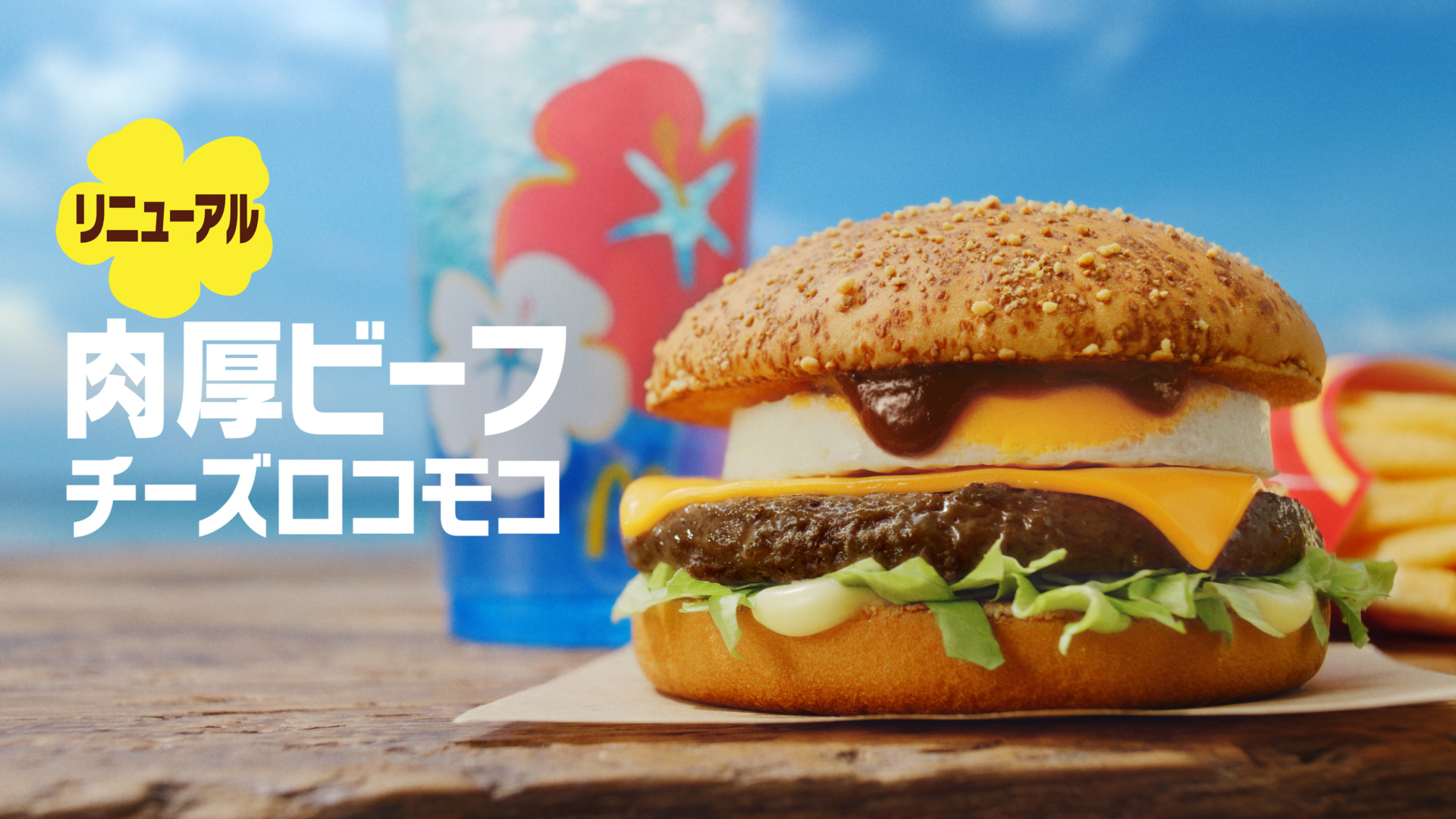 「ハワイの名物料理「ロコモコ」をイメージしたチーズロコモコが今年はよりおいしくなって登場! 10種類以上のスパイスをきかせフルーティに仕上げた特製ハワイアンバーベキューソースのビーフエキスを増量し、よりコクのある味わいにリニューアルしました。ジューシーでつなぎの入っていない、肉厚100%ビーフパティに、クリーミーでコクのあるチェダーチーズとたまごを重ね、粉チーズをトッピングした香ばしいオリジナルバンズでサンドしました。リニューアルしたソースと相性抜群な今だけのおいしさをお楽しみください」