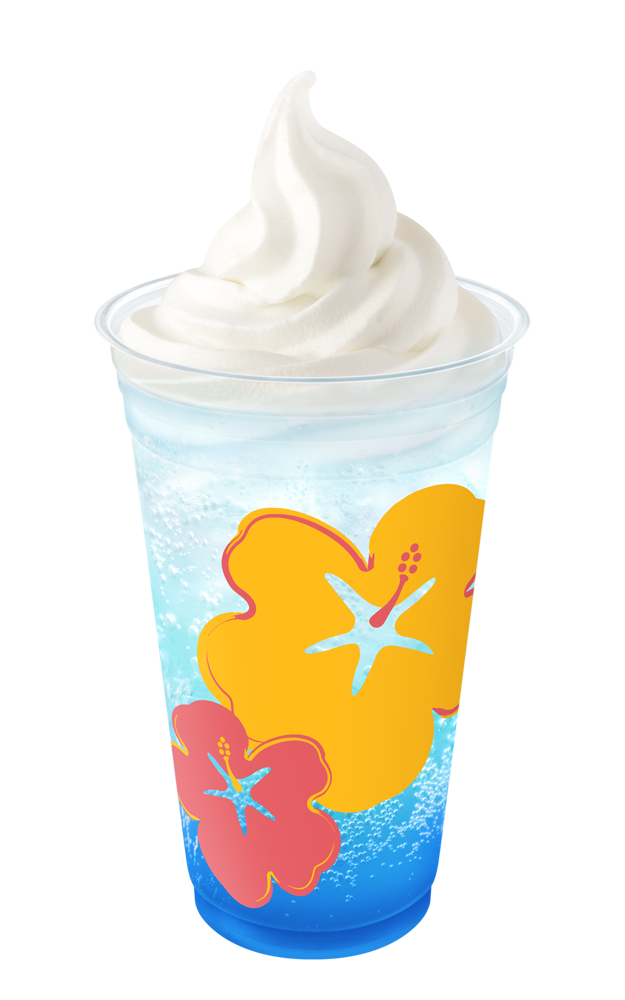 「2025 年真夏のマックフロートは爽快感のある新しい味わいで登場します。りんご果汁を使用したブルーハワイらしい爽快感のある味わいと、ハワイの海をイメージした鮮やかな水色のパステルカラーが見た目にも夏らしさを感じる炭酸ドリンクに、なめらかでコクのあるソフトクリームをトッピングしました。ハワイの海と青空に浮かぶ雲のような夏らしい見た目も楽しめるデザートドリンクです。※りんご果汁1%使用」