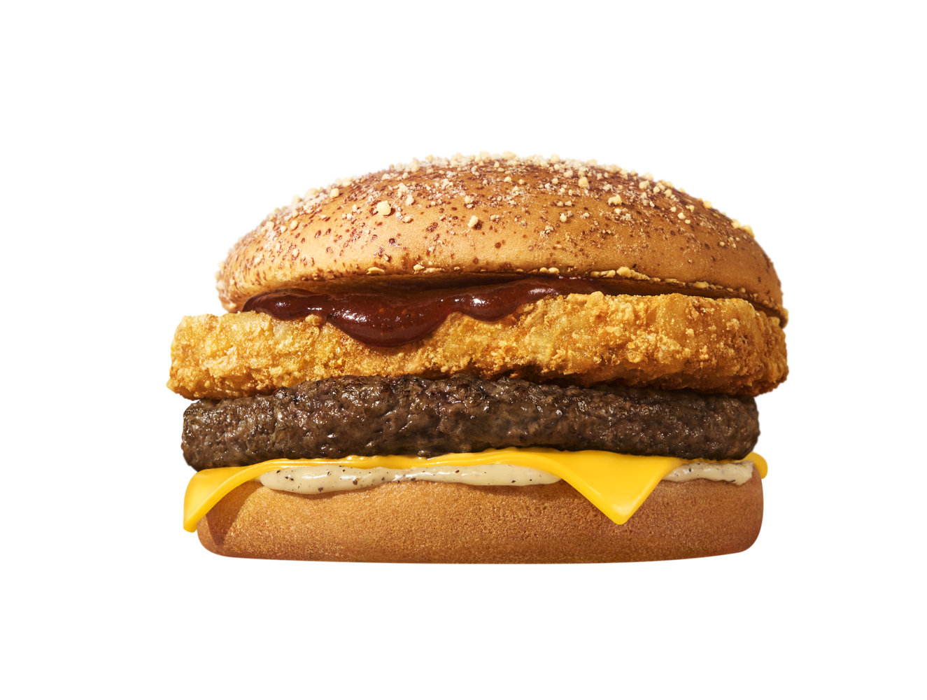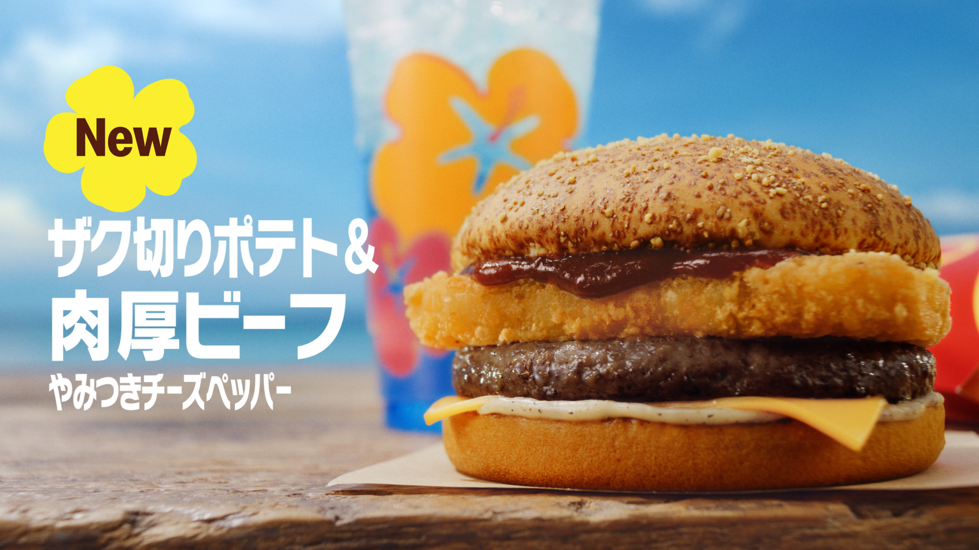 「毎年大好評のザク切りポテト&肉厚ビーフ、今年はスモークチーズペッパーソースで新登場!ジューシーでつなぎの入っていない、肉厚 100%ビーフパティに、外はカリッと中はホクホクのざく切りポテトパティを重ね、粉チーズをトッピングした香ばしいオリジナルバンズでサンドしました。ビーフエキスを増量し、よりコクのある味わいにリニューアルした特製ハワイアンバーベキューソースと、スモークチーズとブラックペッパーの味わいがやみつきになるスモークチーズペッパーソースが相性抜群の、食べ応えと濃厚な味わいが特長の一品です」
