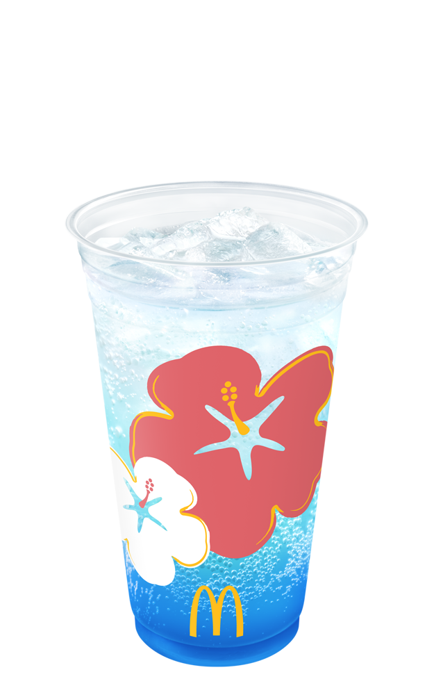 「2025年真夏のマックフィズは爽快感のある新たな味わいで登場します。りんご果汁を使用したブルーハワイらしい爽快感のある味わいと、ハワイの海をイメージした鮮やかな水色のパステルカラーが見た目にも夏らしさを感じる炭酸ドリンクです。※りんご果汁1%使用」